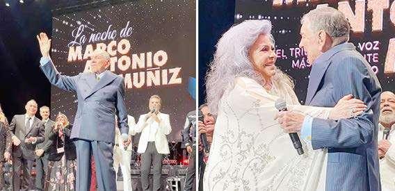 Feliz y emocionado fue como apareció en el escenario del Auditorio Nacional el cantante Marco Antonio Muñiz, quien recibió la noche de ayer un emotivo homenaje por parte de sus amigos y familia, para celebrar más de 70 años de carrera y su vida.