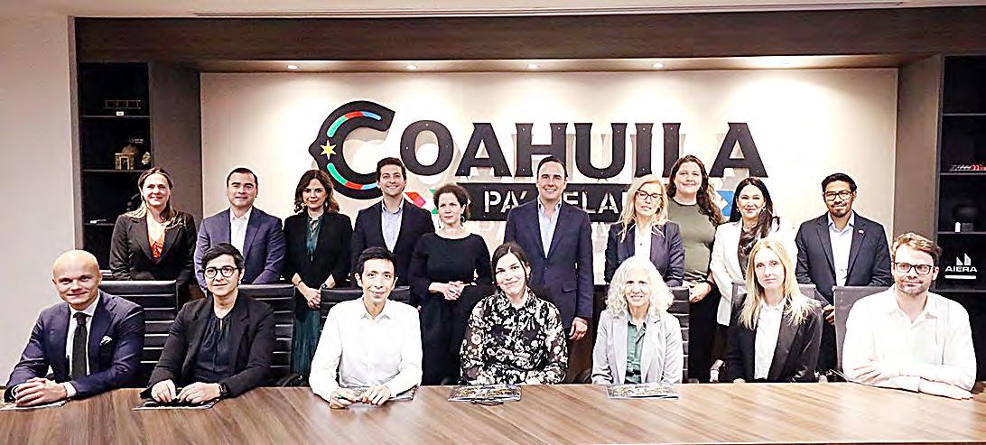 El gobernador Manolo Jiménez Salinas sostuvo una reunión de trabajo con integrantes de la Sección Económica y Comercial de la Unión Europea en México, así como con consejeros y consejeras económicos de 10 países de la región, con el objetivo de fortalecer la promoción de Coahuila como destino estratégico para la inversión europea. El Mandatario estatal presentó las principales fortalezas competitivas de la entidad en materia de Seguridad, Estado de Derecho, desarrollo indus-