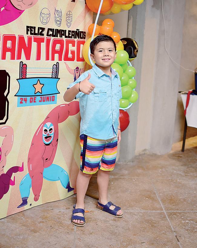 de lucha libre. Los encargados de que to dos pasaron una bonita tar de fueron sus papás Paloma Aréchiga y Alejandro Portillo. Los invitados presentes dis frutaron de la alberca, poste riormente quebraron la piña ta y le cantaron Las Mañanitas a Juan Santiago mientras apa gó la velita de su pastel.