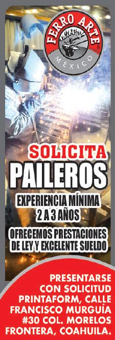 CRAMSA solicita: Operador de Retroexcavadora para maniobra con martillo; Paileros, Soldadores con especialidad en Microalambre. Interesados presentarse con solicitud elaborada, copia de identificación oficial y constancia de situación fiscal en Avenida Chapultepec 819 Colonia Progreso, Monclova Coahuila. Para mayores informes comunicarse al tel. 866-632-90-42 y 866-8632-90-43. (58215 : 13-May : 21-May)