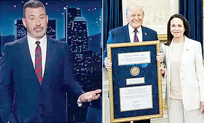 A través de una publicación en Truth Social, el mandatario estadounidense expresó que fue “un gran honor” conocer a Machado y que le “obsequió” su Premio Nobel de la Paz debido al “trabajo” que ha realizado durante su gestión. Jimmy Kimmel trolea a Trump tras recibir Nobel de María Corina Machado