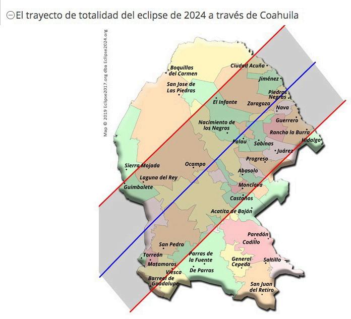 Algunas ciudades serán cubiertas totalmente por el eclipse, es el caso de Piedras Negras, Torreón, Monclova, Acuña, Frontera, Matamoros, Múzquiz, Nava, Sabinas, San Buenaventura y San Juan de Sabinas. De acuerdo con el instructor