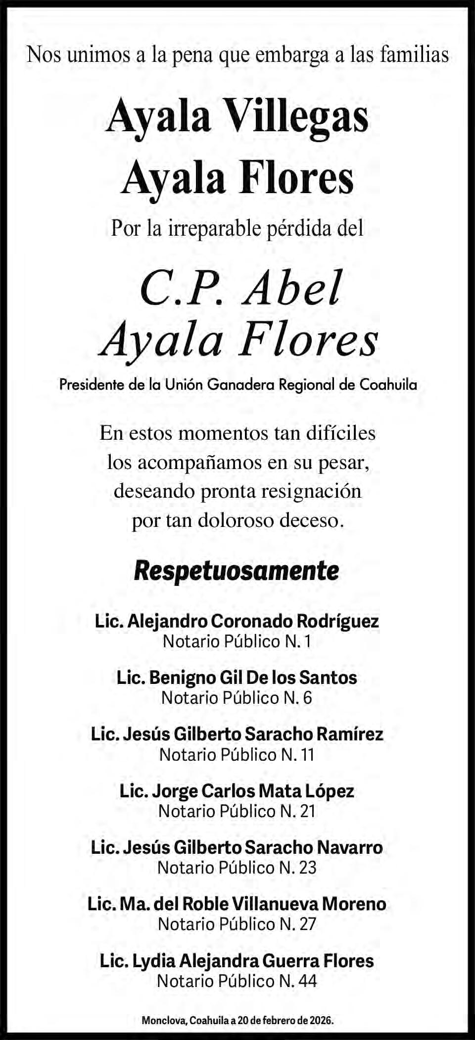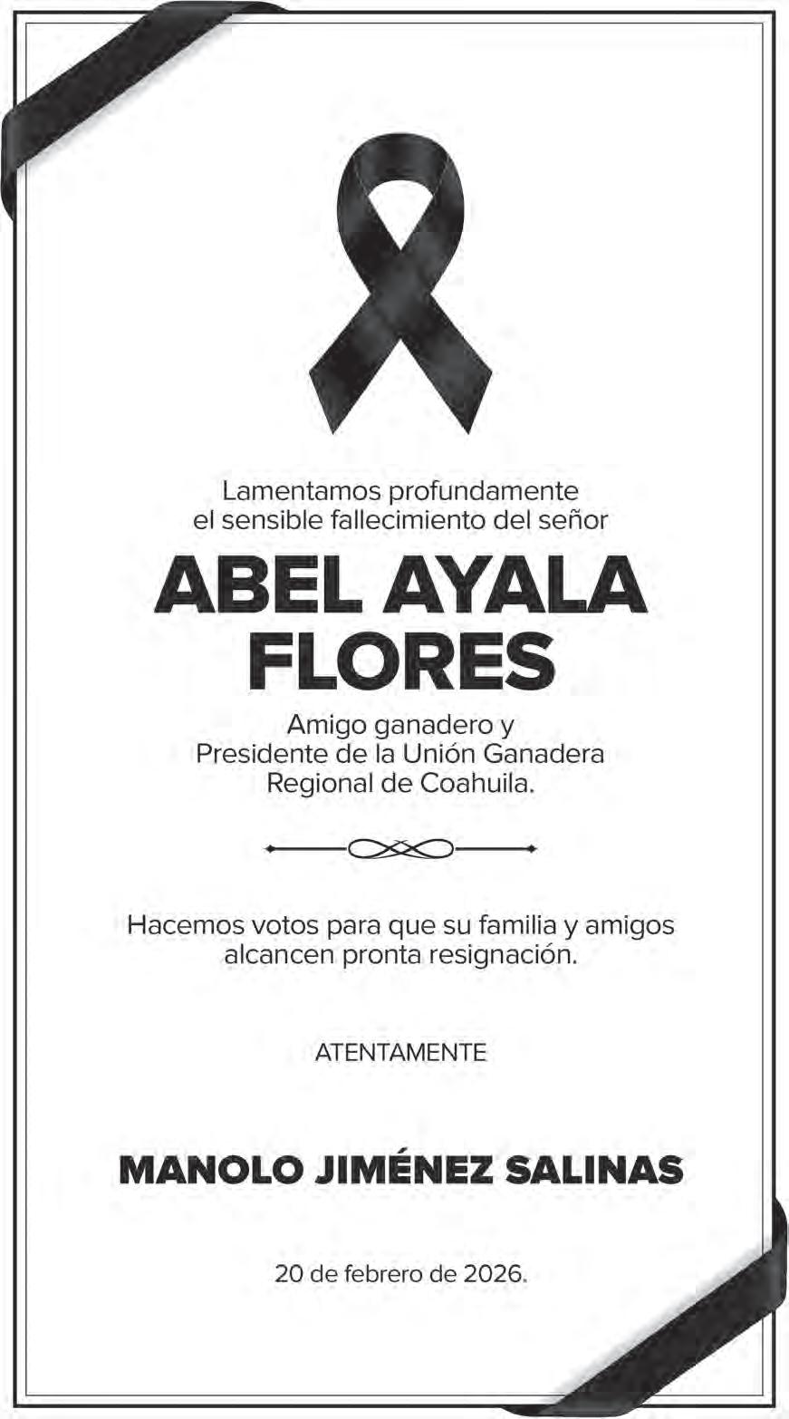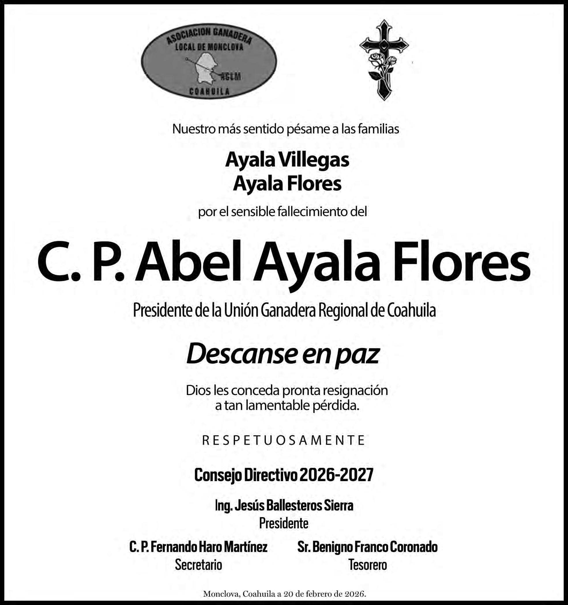 Abel Ayala Flores, presidente de la Unión Regional Ganadera de Coahuila, falleció esta tarde en un hospital de Monterrey, donde tenía varios días atendiéndose de complicaciones de salud.