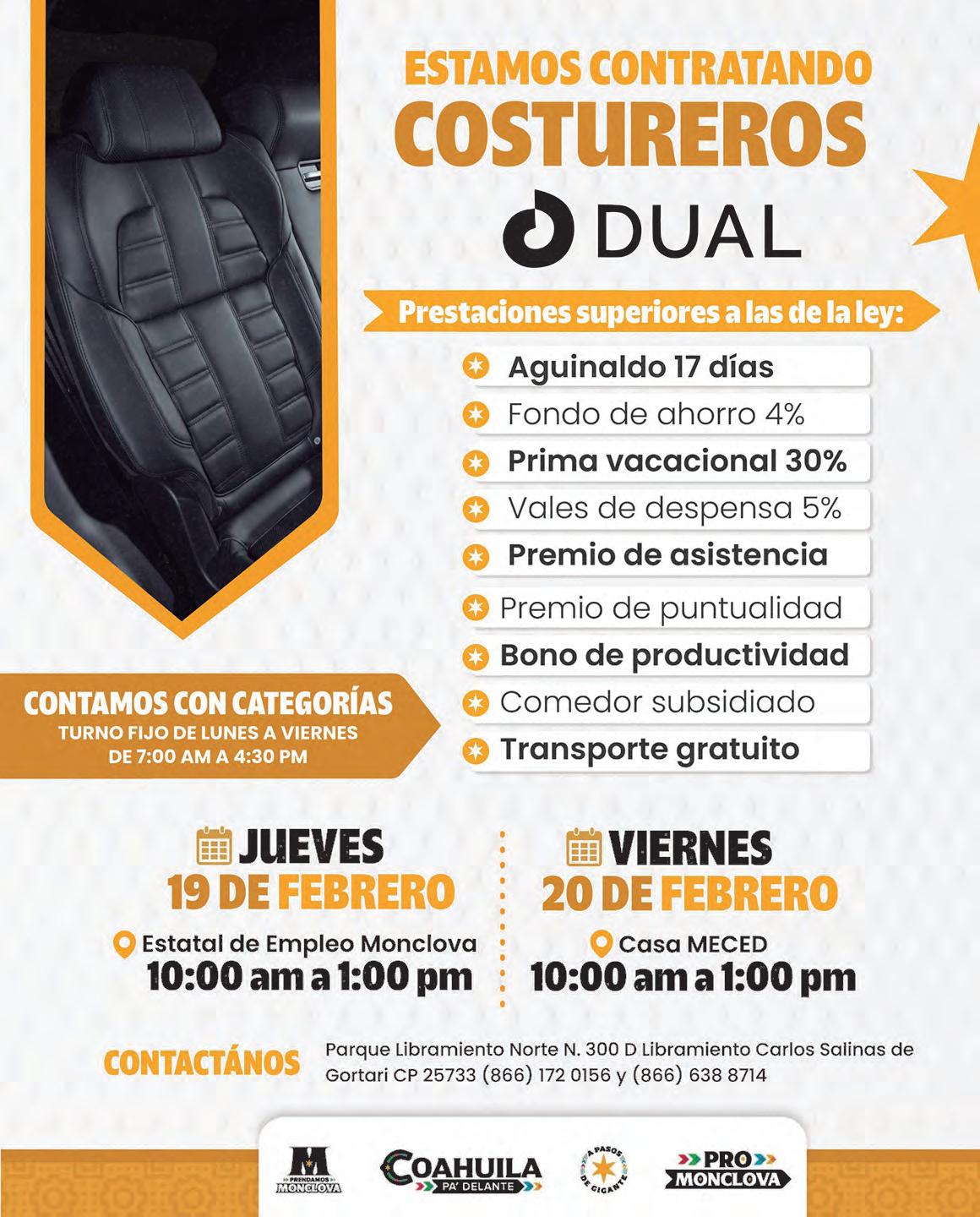 Dual que está buscando casa en Monclova para vivir aquí. Cabe señalar que a la jornada de empleo asistieron un total de 60 buscadores de empleo, y mientras unos manifestaron tener experiencia en costura automotriz, otros reconocieron que no. A los que no tienen experiencia, la entrevistada les recomendó que se inscriban en cursos del ICATEC Monclova o el de Frontera para que aprendan de costura automotriz. Explicó que los cursos son gratuitos y tienen una duración de un mes, y participar en ellos puede representar una garantía para que sean contratados en la planta de Dual de Monclova, aunque primero tendrían que aprobar un filtro de costura y un examen médico.