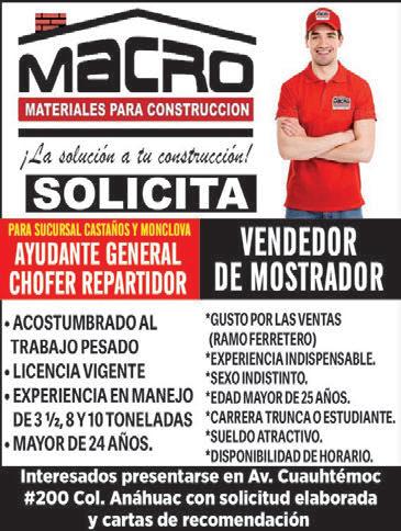 SOLICITA SODADOR, TRABAJO DE LUNES A VIERNES. PRESTACIONES DE LEY. INFORMES AL 866-23549-75. (58364 : 20-Jul : 02-Sep)