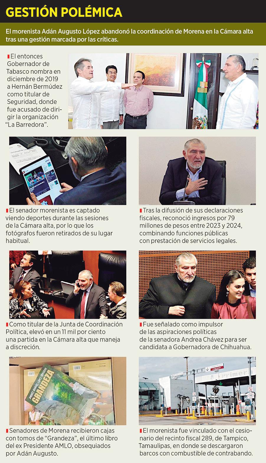 z El costo reputacional del “caso Tabasco” pesaba demasiado en el ánimo presidencial. La sombra de Hernán Bermúdez Requena –el exjefe de seguridad de Adán en el estado, investigado y señalado por liderar presuntamente al grupo criminal “La Barredora”–perseguía al senador desde el año pasado. z Ayer, en respuesta a la renuncia del legislador como coordinador de bancada, Mexicanos Contra la Corrupción y la Impunidad anunció la publicación de una investigación titulada “La Barredora guinda”, en alusión a los nexos del partido político y el grupo criminal ligado al CJNG.