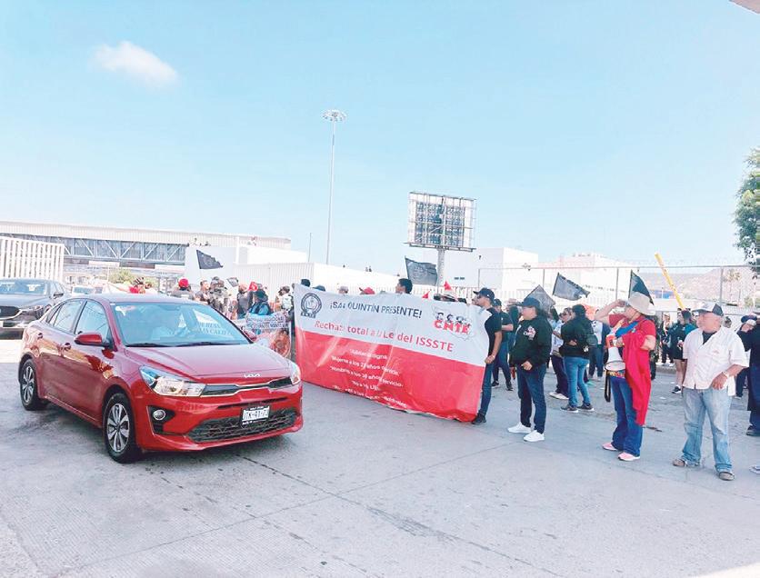 z Los maestros portaban mantas que dicen “Movimiento de Resistencia Estatal de Baja California, magisterio exige pago inmediato a interinos, basificación 6-1, rechazo total a la ley de Usicamm (Unidad del sistema para la carrera de maestras y maestros), No a las Umas. Sí a salarios mínimos en pensiones y jubilaciones”.