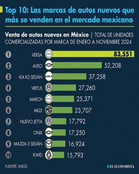 Entre enero y noviembre del 2024, en México se ha observado que el auto estrella en ventas es el Nissan Versa, con un total de 83 mil 551 unidades comercializadas dentro del mercado nacional.
