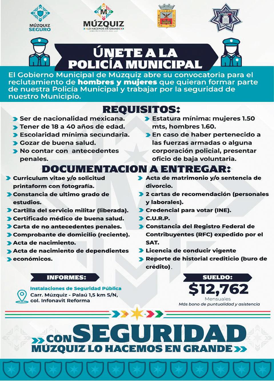 Con el objetivo de fortalecer la seguridad y brindar un mejor servicio a la ciudadanía, el Gobierno Municipal de Múzquiz lanzó la convocatoria para el reclutamiento de hombres y mujeres interesados en formar parte de la Policía Municipal. La invitación está dirigida a personas de nacionalidad mexicana, de entre 18 y 40 años de edad, con escolaridad mínima de secundaria, buena salud y sin antecedentes penales, que deseen contribuir activamente a la protección y el orden en el municipio. Entre los requisitos se establece una estatura mínima de 1.50 metros para mujeres y 1.60 metros para hombres, además de cumplir con la documentación solicitada, que deberá entregarse en las instalaciones de Seguridad Pública, ubicadas en la carretera Múzquiz–Palaú, kilómetro 1.5 s/n, colonia Infonavit Reforma. Con esta convocatoria, el Gobierno Municipal reafirma su compromiso de seguir fortaleciendo las instituciones de seguridad y trabajar por un Múzquiz más seguro para todas y todos.