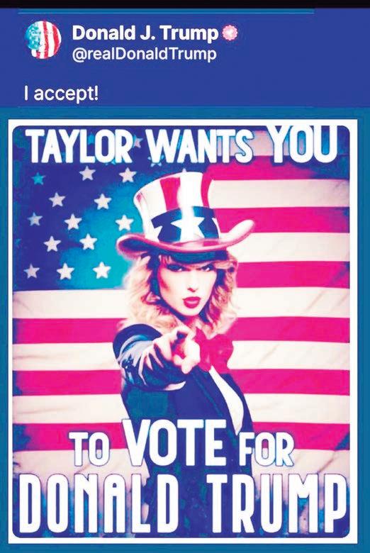 Sugiere que Taylor Swift le apoya z Donald Trump compartió imágenes trucadas en las redes sociales con las que se atribuye el apoyo de Taylor Swift y de sus fans a su campaña electoral, en un aparente esfuerzo por aprovechar la influencia de la cantante pop en las elecciones en Estados Unidos.
