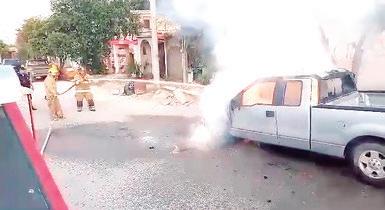 Un voraz incendio consumió parte del motor y cabina de una camioneta que se encon traba estacionada al exterior de un domicilio de la colonia Sarabia, en hechos que ocu rrieron ayer durante la ma drugada.