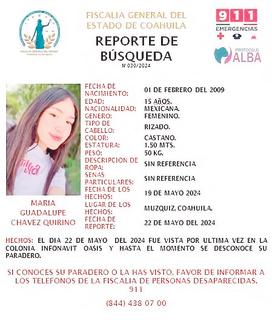 La Fiscalía de Personas Desaparecidas solicitó la colaboración de la ciudadanía para ubicar a una menor de 15 años de edad, quien fue reportada como no localizada desde el pasado miércoles en la colonia Infonavit Reforma de este municipio. Se trata de una joven identificada como María Guadalupe Chávez Quirino, quien fue reportada como desaparecida por parte de sus familiares, luego de que fue vista por
