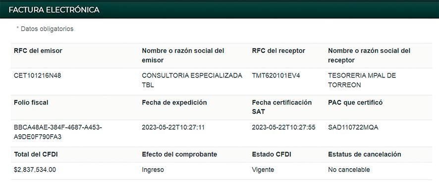 Aunque son factureros en los hechos. Del total, seis documentos fueron cobrados durante el ejercicio fiscal 2024, emitidos entre el 12 de marzo y el 26 de agosto, y tres más en 2023, timbrados del 22 de mayo al 21 de julio. La cifra no es menor y se repite sistemáticamente: cuatro facturas avalan el desembolso de 2 millones 837 mil 534 pesos, y cinco más son buenas por 3 millones 684 mil 11 pesos. Verificadas por separado en el Servicio de Administración Tributaria (SAT), en todas consta que la leyenda “ingreso” certifica la recepción de los pagos. Pese al dispendio de casi 30 millones de pesos en suma, en la información pública de oficio del Ayuntamiento