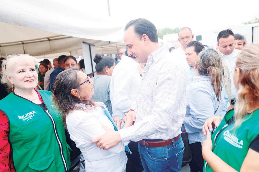 Acompañado por Luz Elena Morales, presidenta de la Junta de Gobierno del Congreso del Estado; Gabriel Elizondo Pérez, coordinador general de Mejo ra Coahuila, y titulares de dis tintas dependencias estatales, el Mandatario estatal recorrió los módulos instalados en la plaza principal del ejido Piedras Negras, donde convivió con familias y estudiantes de instituciones educativas. El Gobernador manifestó que su Administración sigue avanzando con el desarrollo integral del estado, mediante programas que atienden de manera directa las necesidades de la población.