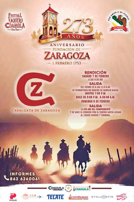 La Administración Municipal 2025-2027 “Por Amor a Mi Pueblo” en coordinación con el comité organizador, invita a la ciudadanía a participar en las actividades conmemorativas del 273 aniversario de la Fundación de Zaragoza con la tradicional cabalgata el 7 y el 8 de febrero, informó el alcalde Evelio Vara Rivera. Agregó que las actividades se celebrarán en el marco del Festival Vaquero Coahuila Tour 2026 y la fundación del municipio de Zaragoza data del 1 de febrero de 1753. La Cabalgata resalta las raíces, costumbres y tradiciones del pueblo, las actividades da-
