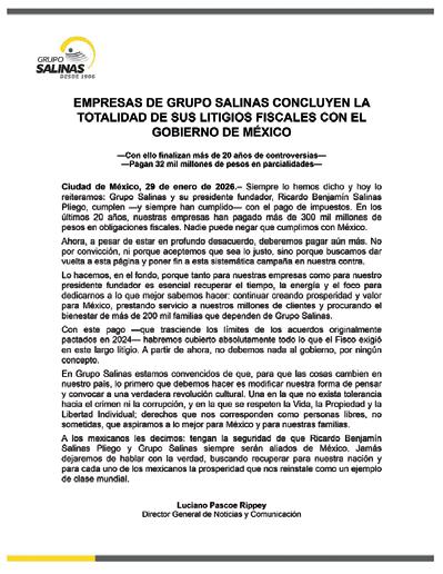 Tributaria reiteró que tras el pago de más de 10 mil 400 millones de pesos, el empresario Ricardo Salinas Pliego deberá saldar su deuda, estimada en 32 mil millones de pesos a través de pagos que realizará a lo largo de 18 meses n Negocios