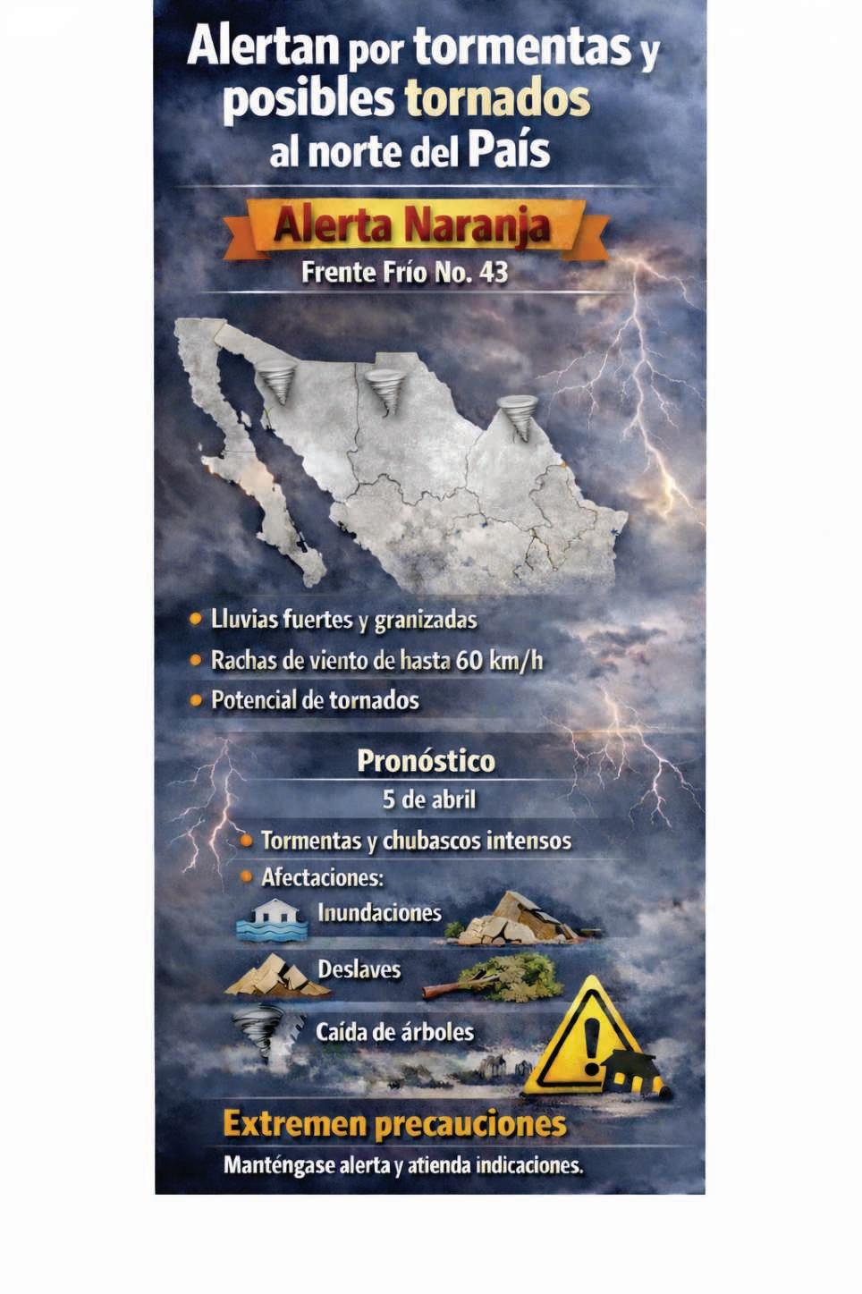 “El semáforo de alertamien to se mantiene en Alerta Na ranja en la Región Norte del país por el avance del frente frío número 43. “Se incrementa la probabi lidad de tornados en el nor te de Coahuila, Nuevo León y Tamaulipas, principalmen te en la frontera con Estados Unidos”.
