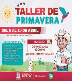 El Ayuntamiento de Nava, a través del área de Educación Municipal, publicó la invitación a niñas y niños para participar en el taller de primavera que se llevará a cabo del 6 al 10 de abril, en un horario de 10:00 de la mañana a 12:00 del mediodía, en distintas bibliotecas del municipio de Nava. El programa está dirigido a menores de entre 6 y 10 años de edad y será totalmente gratuito, con el objetivo de fomentar el aprendizaje, la creatividad y la sana convivencia durante el periodo vacacional.