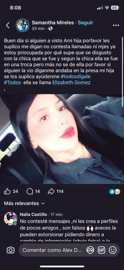 La última información disponible de esta joven señalaba que Elizabeth, se trasladó a la presa a bordo de una camioneta junto a unas amigas; sin embargo, no se tiene certeza sobre su paradero.