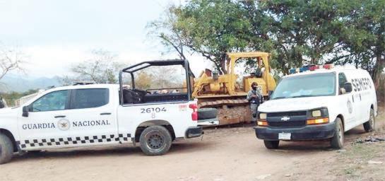 z Vehículos de la Guardia Nacional y Semefo en las inmediaciones de una fosa común hallada en El Verde, Sinaloa.