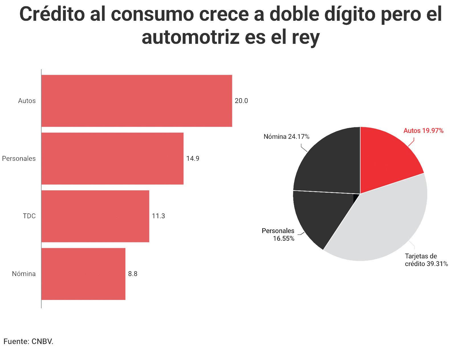 El especialista destacó que dentro del crédito al consumo, que aglomera a las tarjetas de crédito, los préstamos personales y de nómina así como los de auto, estos últimos son el que tienen un mejor dinamismo y se ha generado una recomposición de esta cartera, ya que los montos prestados superan a los créditos personales.