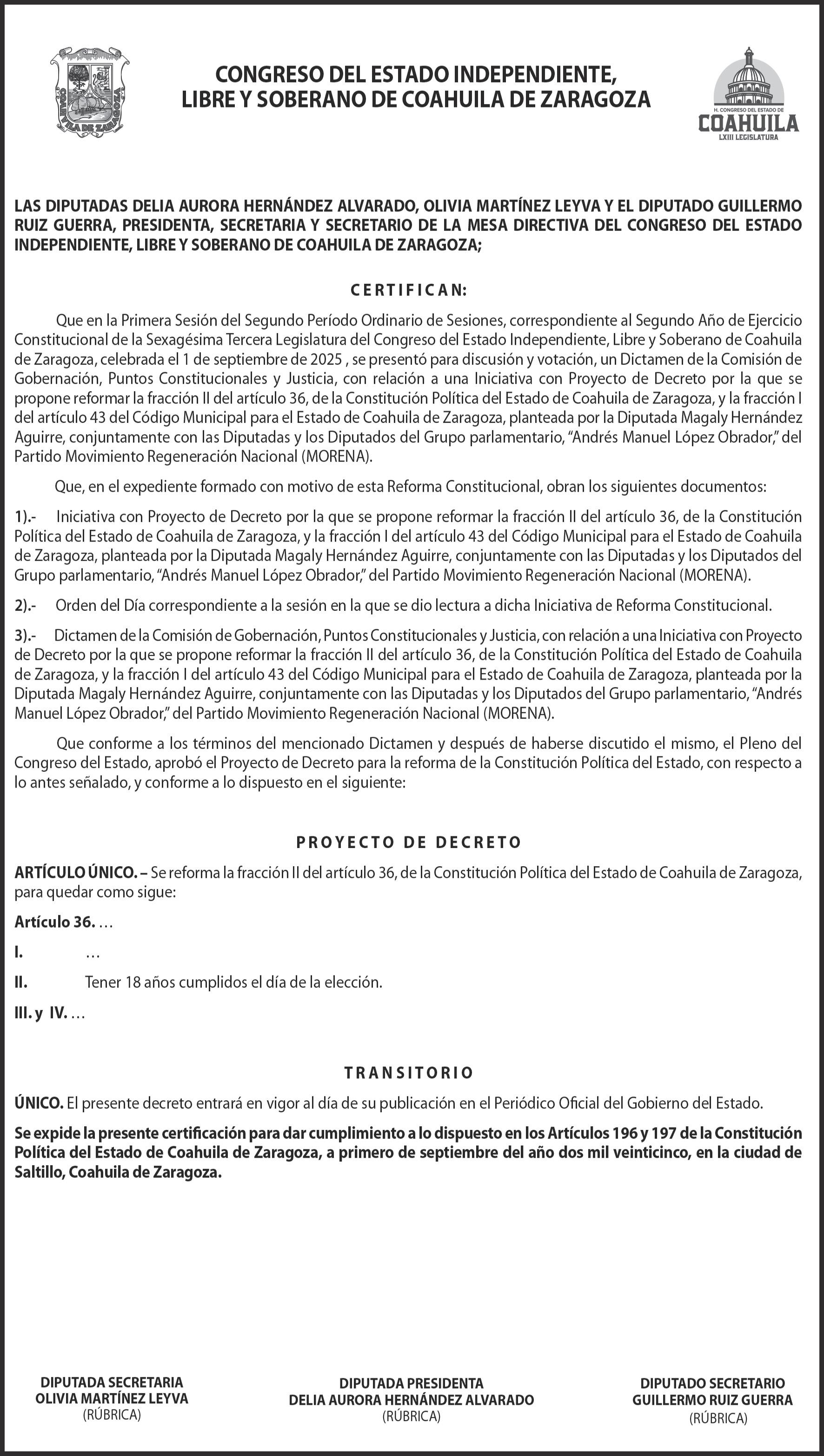 A partir de la próxima elección de diputados locales podrán postularse personas de 18 años, –en lugar de 21–, mediante una reforma a la Constitución de Coahuila, propuesta por la diputada Magaly Hernández Aguirre. La legisladora morenista señaló que el requisito de 21 años para ser aspirante es discriminatorio, subestima la capacidad de los jóvenes y excluye a un importante sector de la población, pues hay quienes tienen capacidad para ello y desean participar en la toma de decisiones con responsabilidad. El Congreso del Estado reformó el Artículo 36 de la Constitución de Coahuila, que reduce la edad para ser votado y se avanza hacia una representación más justa y representativa que refleje la diversidad y aspiraciones de la sociedad, particularmente de los jóvenes. La modificación atiende a criterios de progresividad y de
