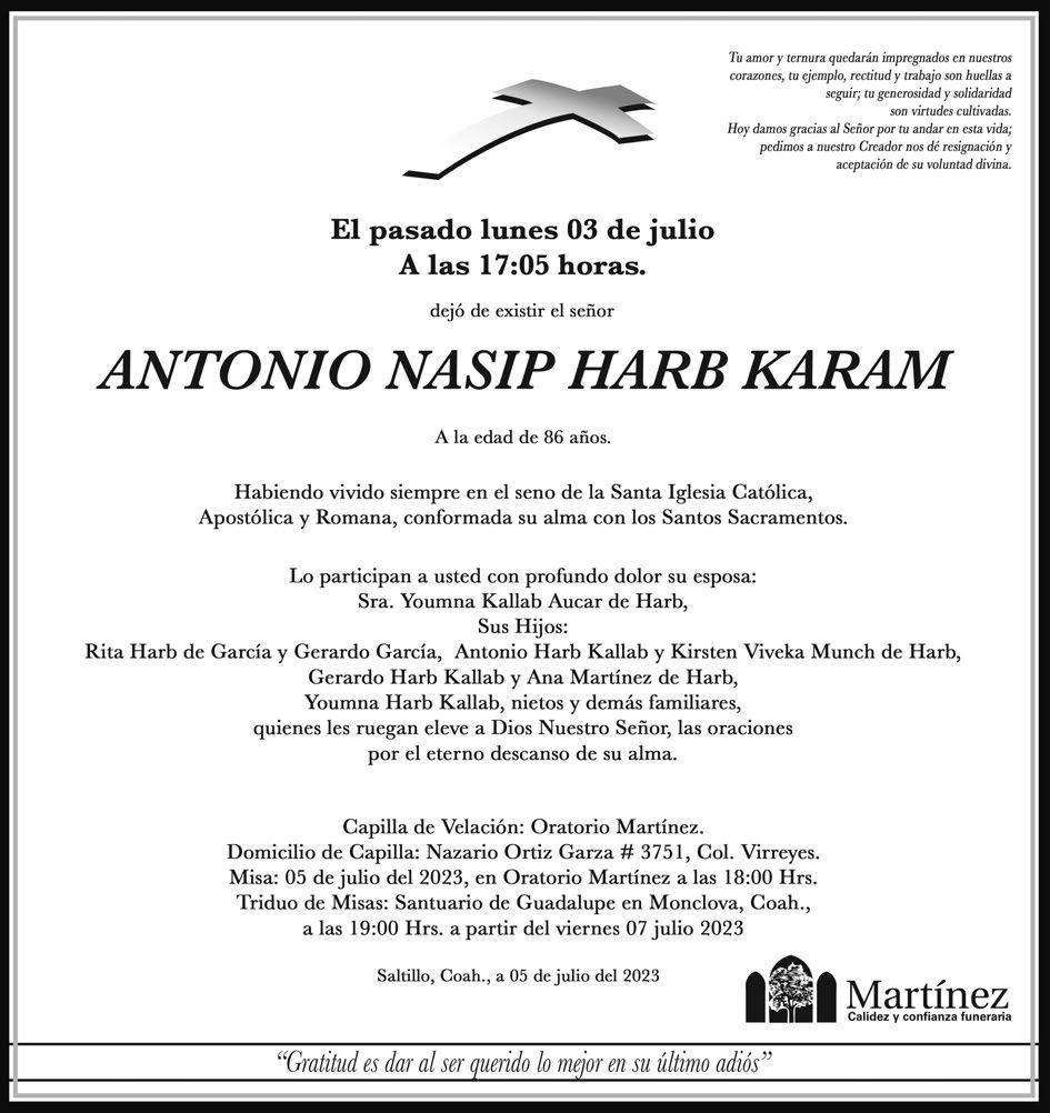 A partir de las 10 de la mañana, en las capilllas funerarias Renacimiento, en Saltillo, se desarrollará el funeral del ingeniero Antonio Harb Karam, monclovense que en el sexenio 1987-1993, a cargo de don Eliseo Mendoza Berrueto, quien falleció en mayo del año pasado, se desempeñó como secretario de Obras Públicas. De acuerdo con el periodista Gerardo Hernández, amigo y excompañero de trabajo del ingeniero Harb, se le despedirá con una misa a las 18:00 horas, en el mismo lugar.