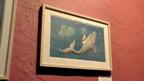 Están desde las acuarelas que remiten a la infancia y su soledad, mientras que otros lápices de colores dan vida a sueños infantiles en los que aparecen ballenas y conejos que habitan la luna.