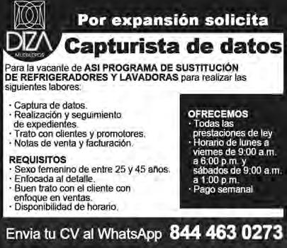 .EMPRESA IMPORTANTE SOLICITA AUXILIAR DE CREDITO Y COBRANZA, DISPONIBILIDAD PARA TRABAJAR FINES DE SEMANA, EXPERIENCIA EN PUESTOS SIMILARES, MANEJO DE EFECTIVO, ARQUEOS Y ATENCION A CLIENTES. INTERESADOS PRESENTARSE EN MIGUEL HIDALGO #1228, CASI ESQUINA CON FRANCISCO COSS O COMUNICARSE AL 844 41444 85. ENTREVISTAS DE LUNES AVIERNES DE 9;00 A 1;00 PM Y DE 4;00 A 6;00 PM .EMPRESA IMPORTANTE SOLICITA AUXILIAR CONTABLE, EXPERIENCIA EN CONTABILIDAD, MANEJO DE OFFICE, TECNICO O CARRERA TRUNCA EN CONTABILIDAD O A FIN.. INTERESADOS PRESENTARSE EN