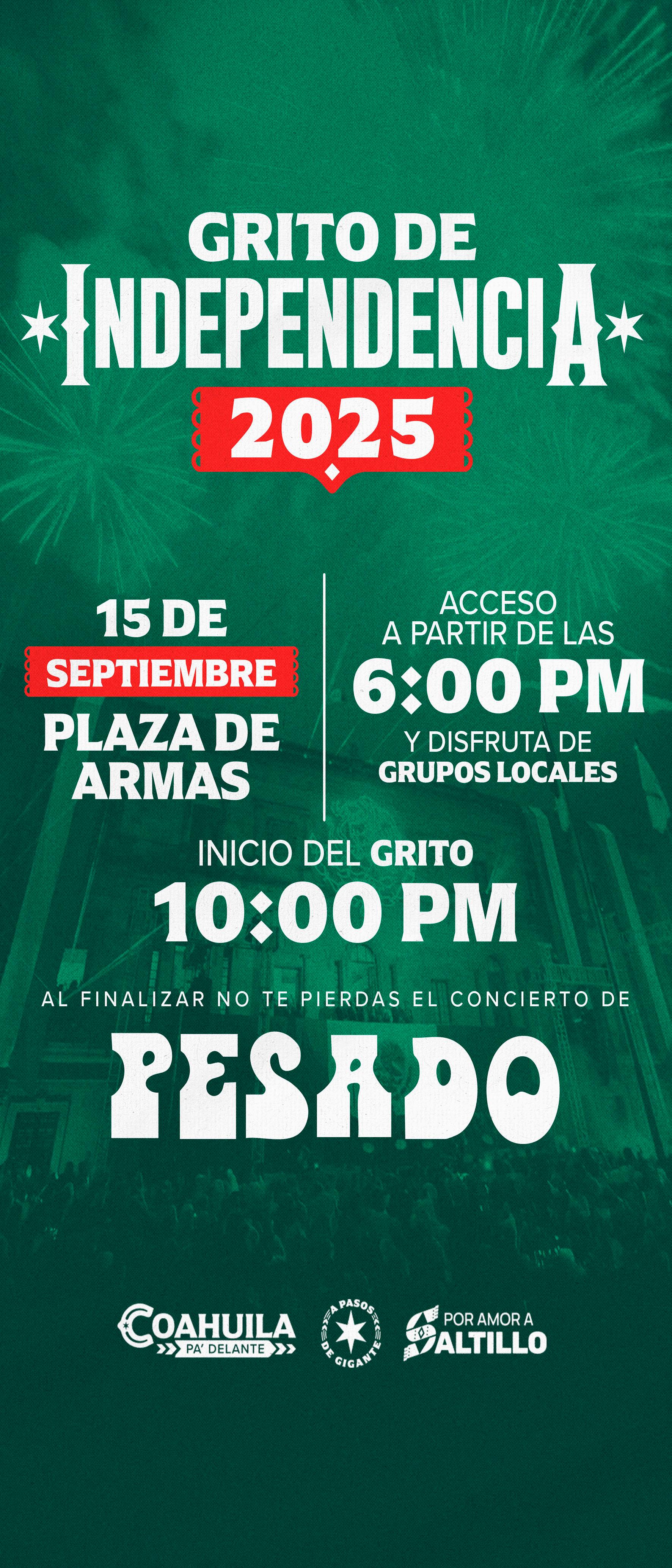 Luego del anuncio de la presencia de Pesado para celebrar el Grito de Independencia en la Plaza de Armas, y para que la experiencia sea aún más cercana, el Gobierno del Estado lanzó un giveaway con 25 pases dobles. Serán 50 ciudadanos los que podrán vivir la ceremonia desde el interior del Palacio de Gobierno, con una vista privilegiada al escenario. Para participar, sólo hay que llenar un formulario en línea.