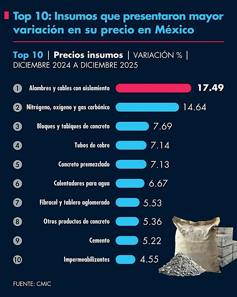 Entre los insumos con mayor incremento de precio destacan los alambres (17.4%), el nitrógeno y oxígeno (14.6%), los bloques y tabiques de concreto (7.6%), así como los tubos de cobre y el concreto premezclado, ambos con un incremento de 7.1 por ciento.