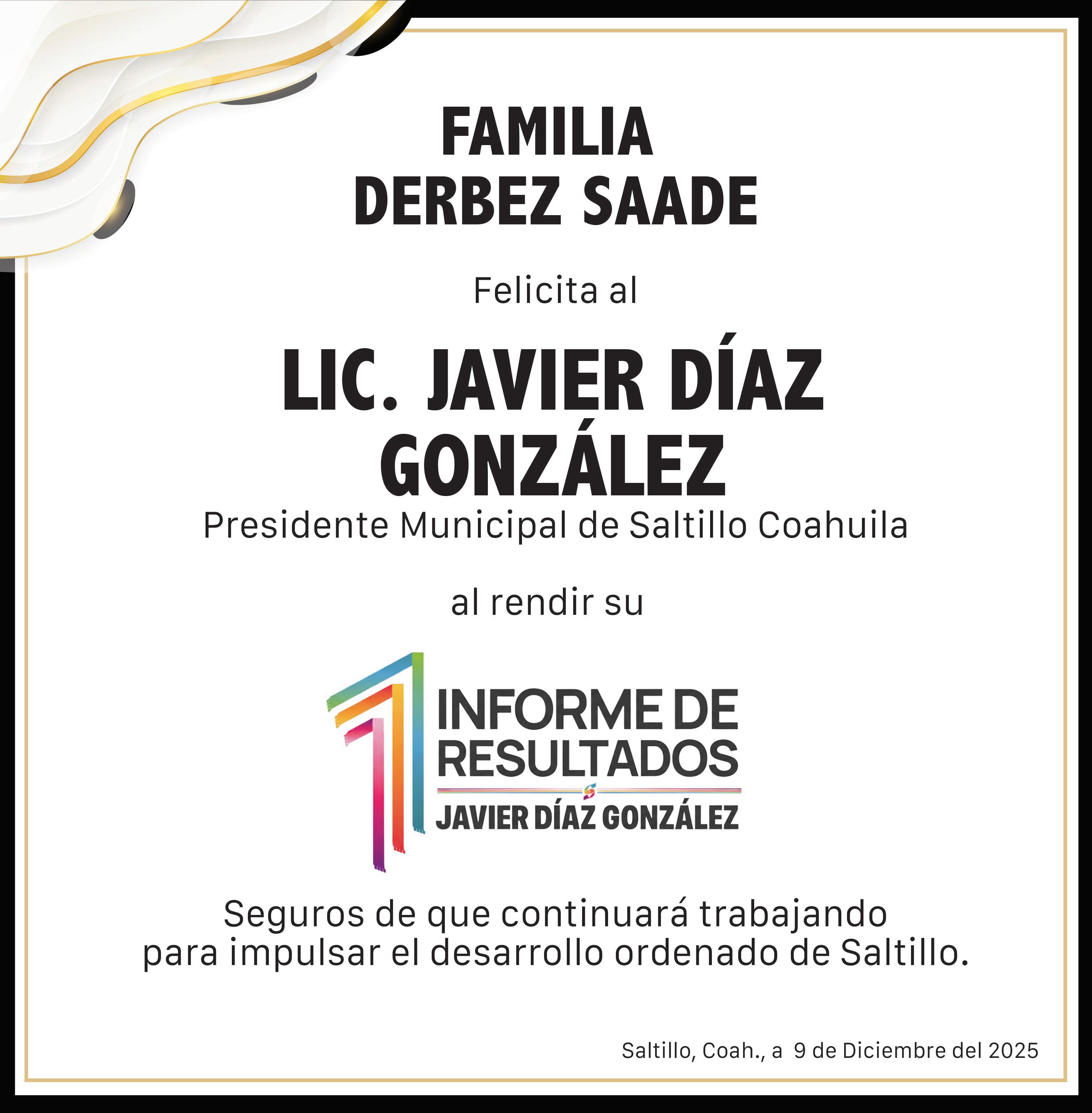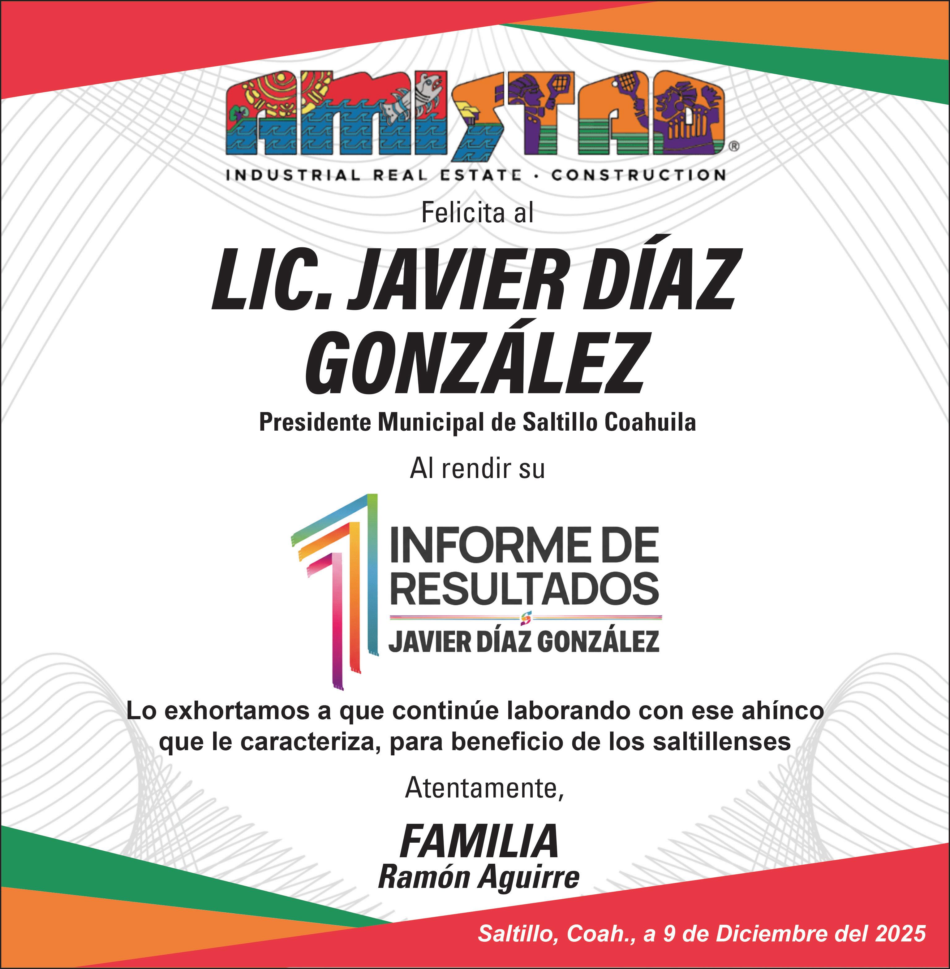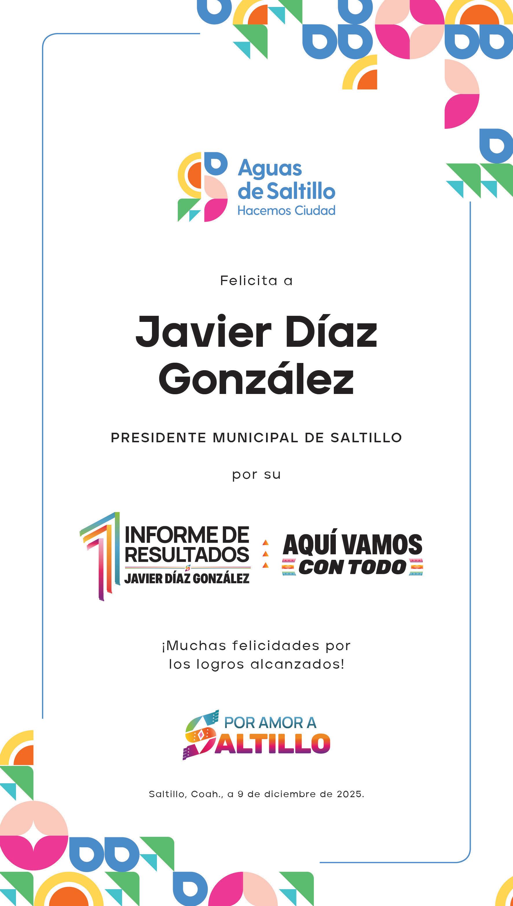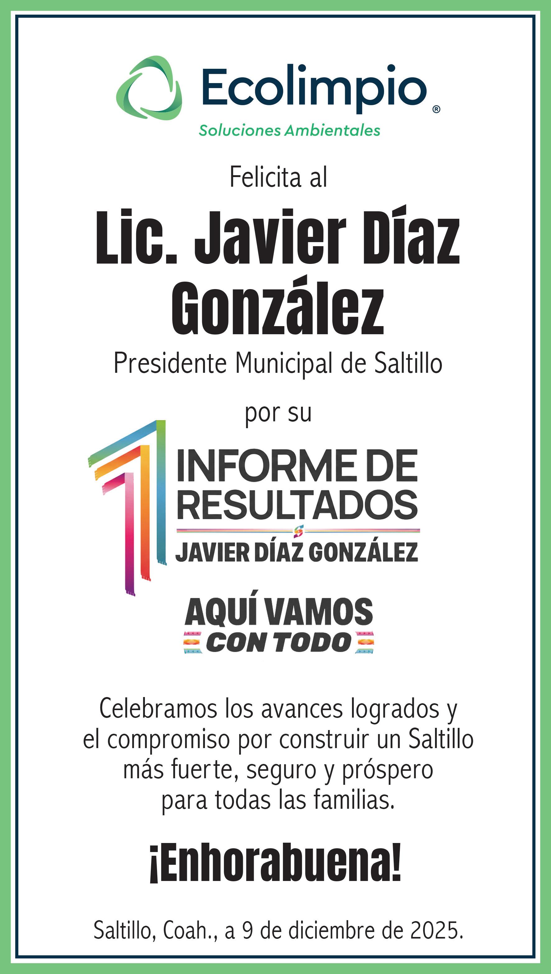 Saltillo es la mejor ciudad para vivir, aseguró el alcalde Javier Díaz González al entregar su Primer Informe de Gobierno al Cabildo. Allí se destacó que se han destinado más de 758 millones de pesos en obra pública, 100 millones al campo y más de mil millones de pesos a la Policía Municipal, lo que ha ayudado a que Saltillo se mantenga como la capital más segura de México. “Que Saltillo sea el punto de encuentro. Aquí no importa el tema de ideología. Al final de cuentas, vamos a ser recordados por lo que hicimos en beneficio de los saltillenses”, dijo.