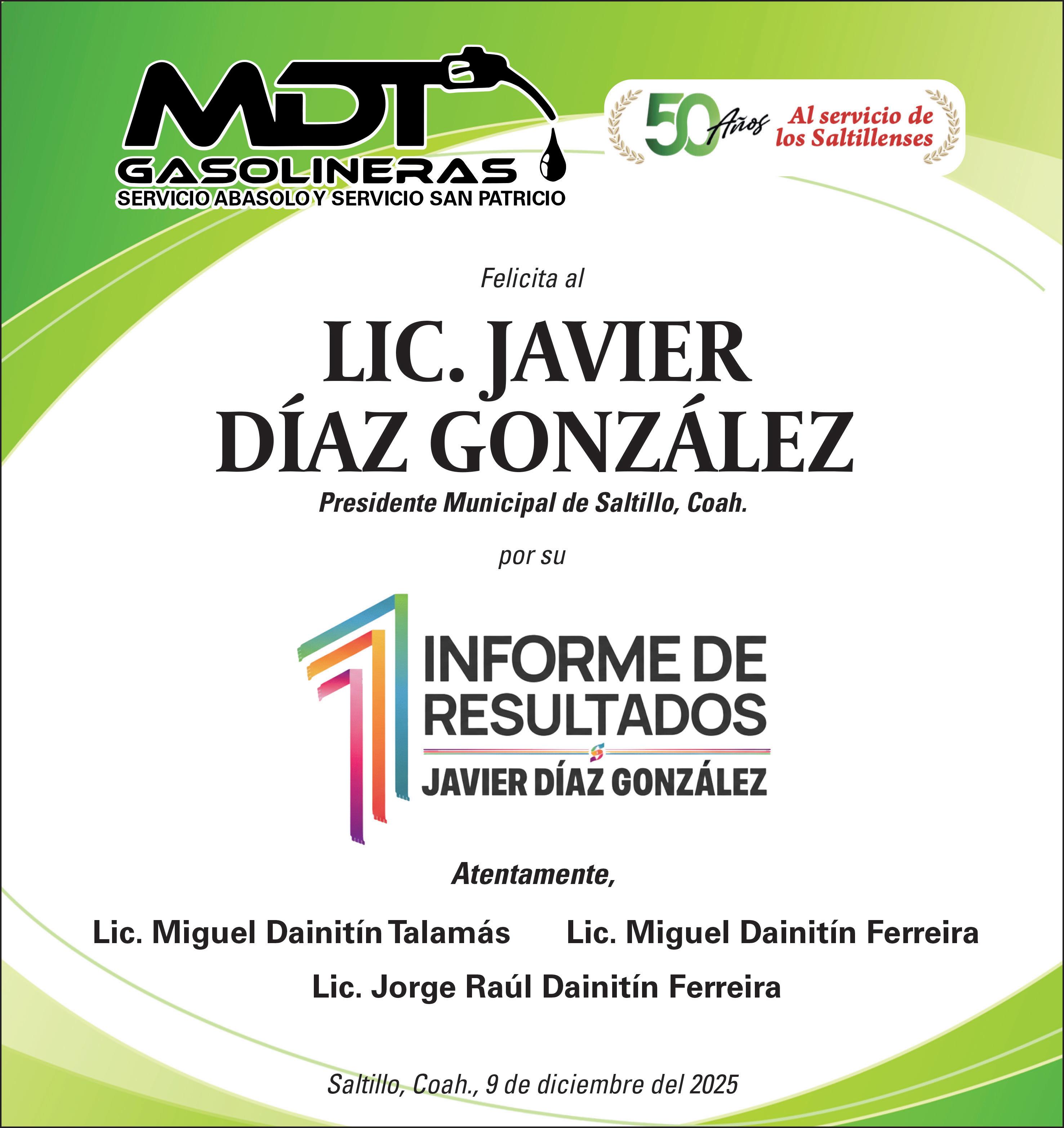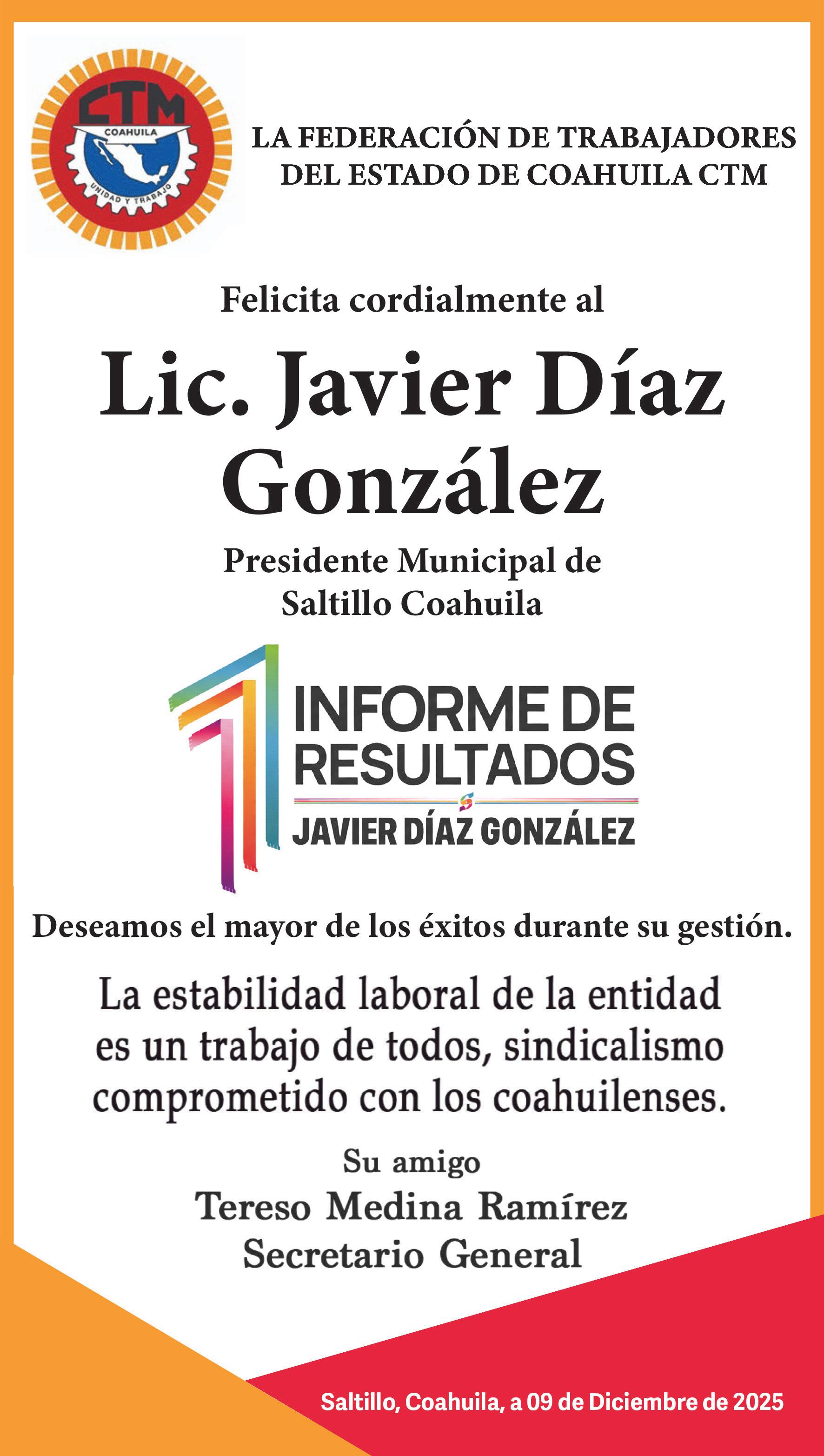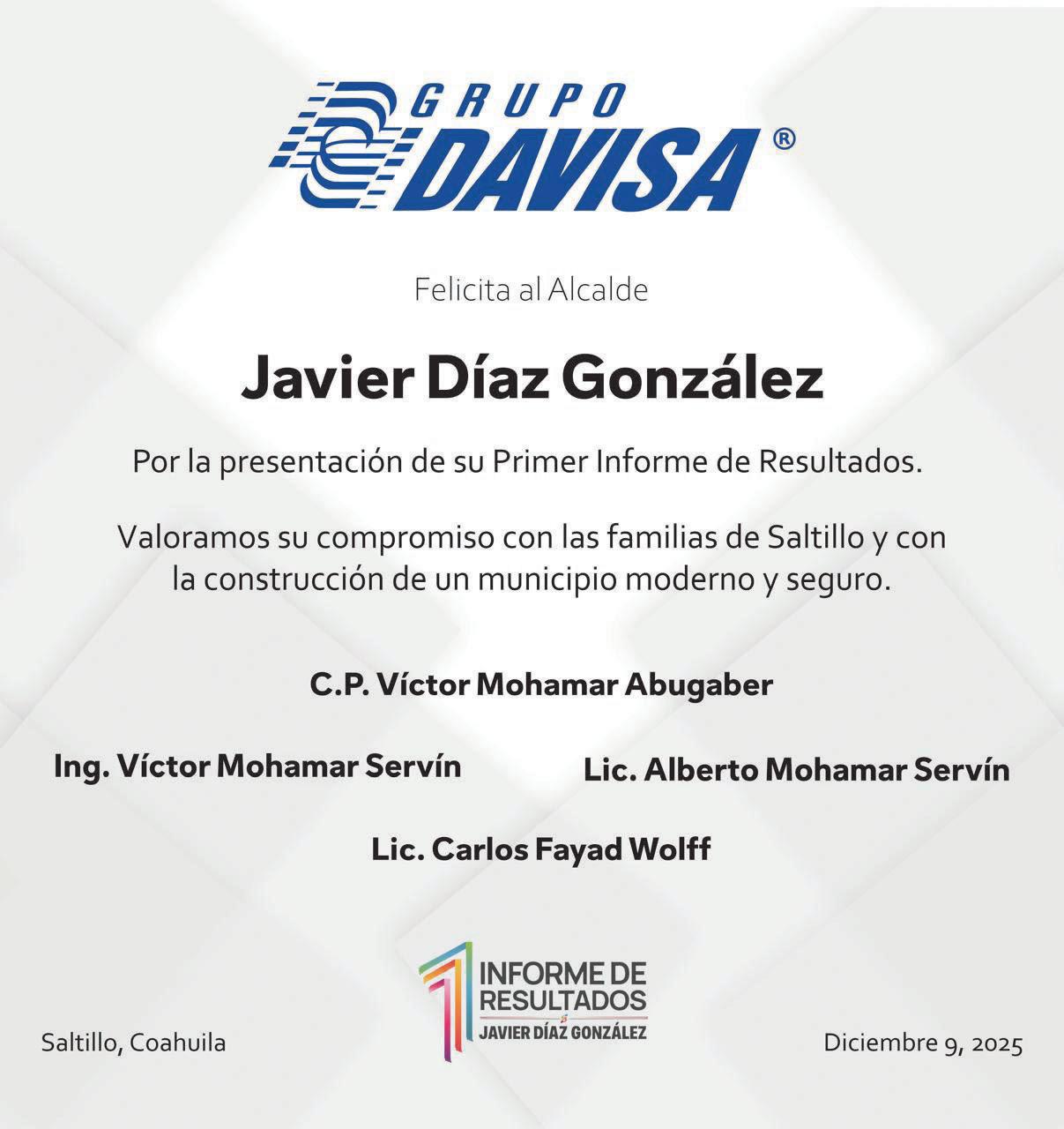 Este martes al filo del mediodía, el alcalde Javier Díaz dará su mensaje ciudadano relativo al Primer Informe de Gobierno. Lo de ayer, por la mañana fue el acto protocolario donde dio una probadita de todo lo que tiene que decir a la comunidad. En términos generales, lleva un sobresaliente en todas las materias, con la inversión pública municipal más alta de Coahuila, así como en seguridad pública. El respaldo con el que llega al cierre de su primer año, por parte de la ciudadanía, Iniciativa Privada y del resto de los sectores es por demás evidente.