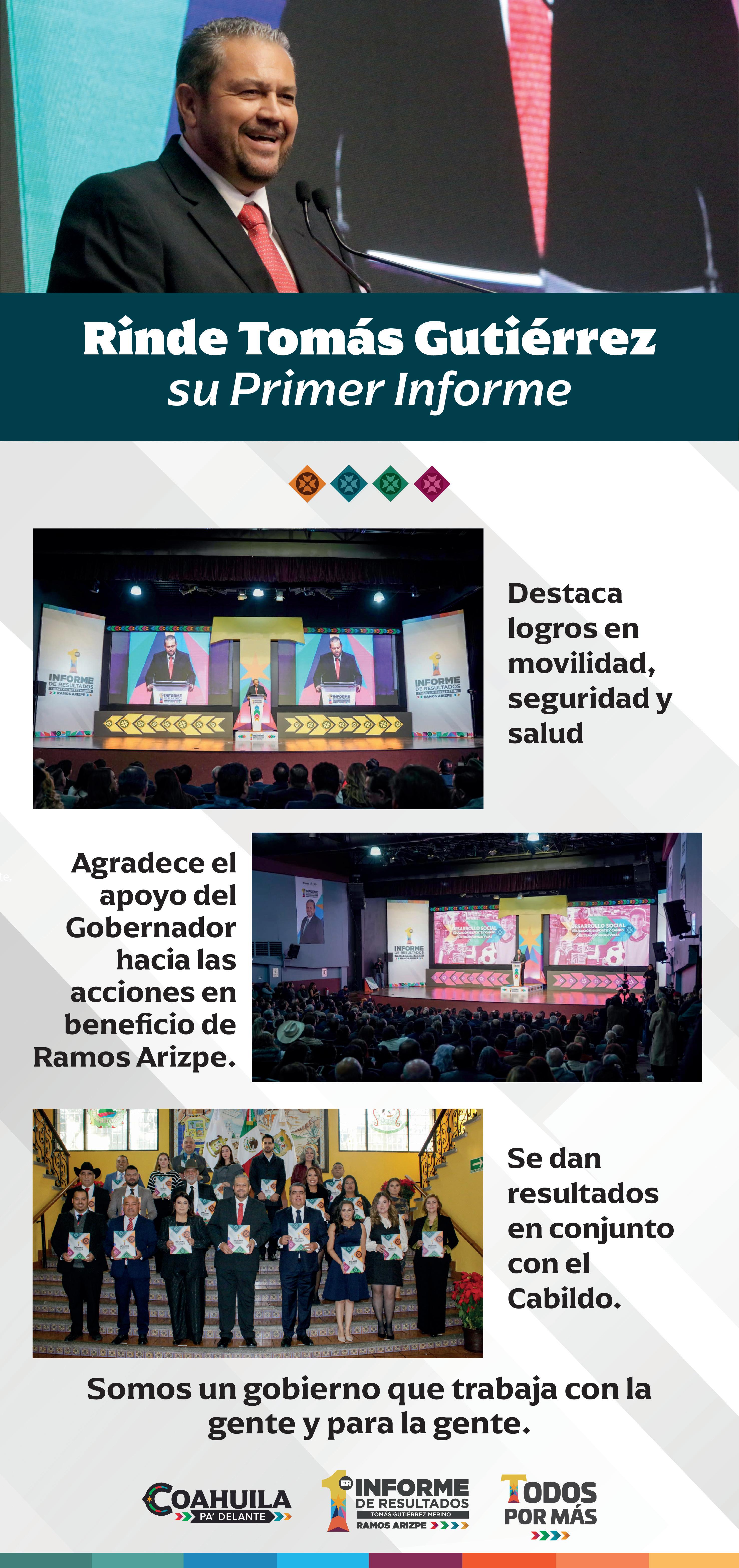 Con total transparencia, el alcalde Tomás Gutiérrez Merino detalló todo lo realizado en Ramos Arizpe durante su primer año al frente del corazón industrial de Coahuila. El Teatro de la Ciudad Eulalio Gutiérrez Ortiz lució a su máxima capacidad. El Edil se vio bien arropado por empresarios, secretarios estatales, funcionarios federales, incluso hasta estuvo el exgobernador Enrique Martínez y Martínez.