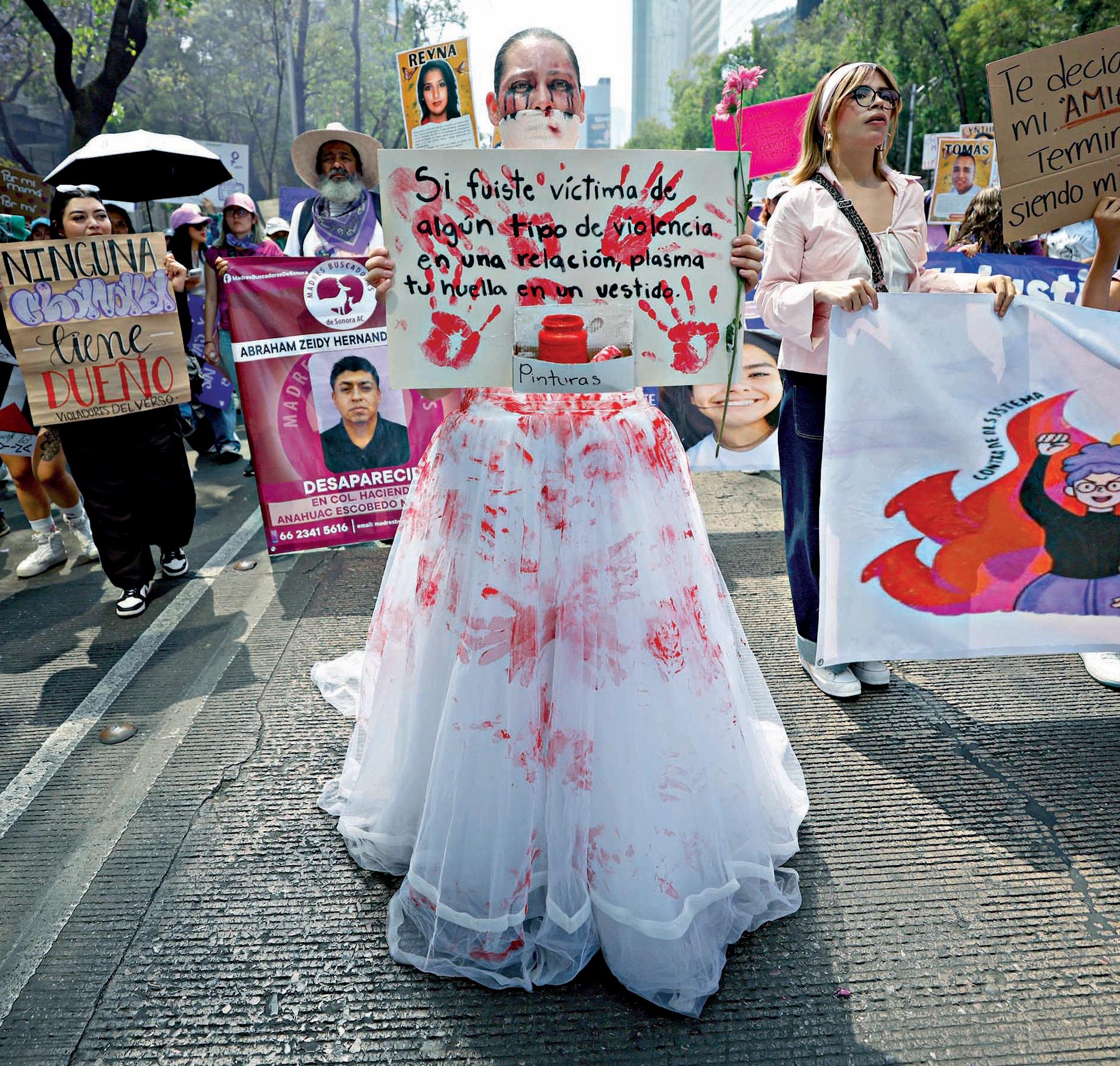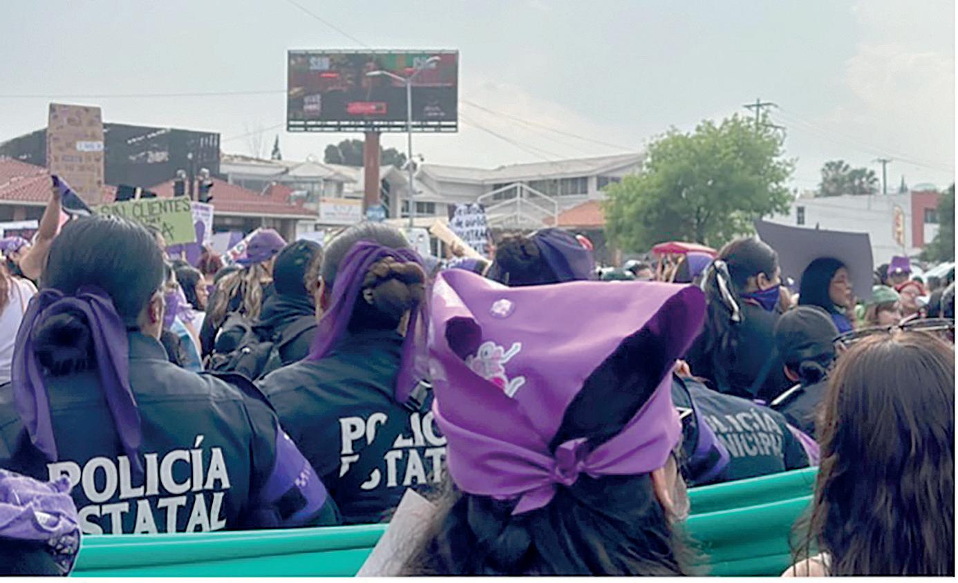 frente a algunos contingentes, particularmente aquellos integrados por colectivas proaborto, víctimas y sobrevivientes de violencia vicaria, mujeres trans y grupos interseccionales. El bloque transincluyente rechazó su presencia. Una mujer encapuchada gritó que se violó el derecho a la libre manifestación. Si las autoridades se colocan detrás, dicen algunas manifestantes, encapsulan la marcha; si se colocan delan-