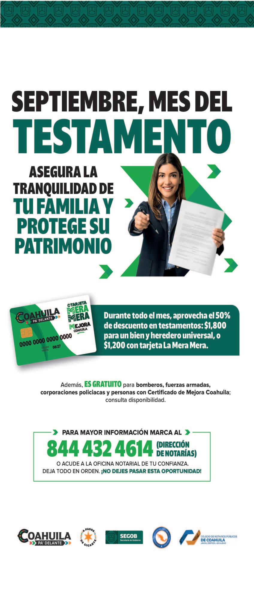 Así, cobra especial relevancia el arranque del Mes del Testamento, donde se hace equipo con el Colegio de Notarios, para ofrecer importantes descuentos, se facilitan los trámites, e incluso hay servicio gratuito para bomberos, policías, elementos castrenses, médicos, enfermeras y beneficiarios de Mejora Coahuila.