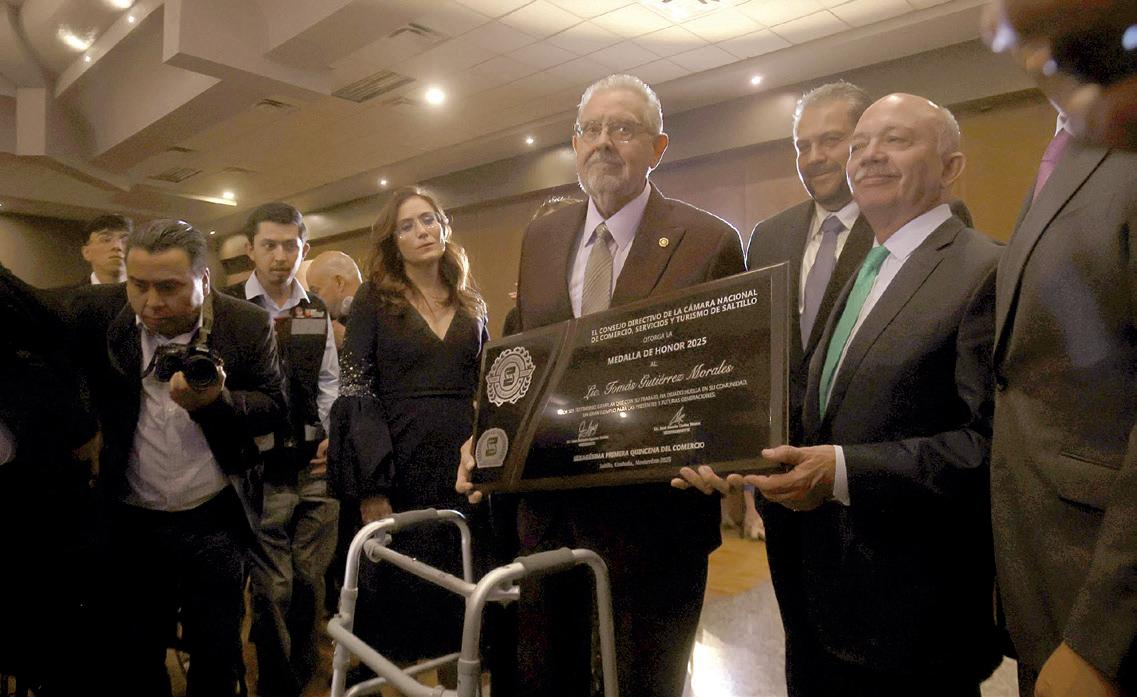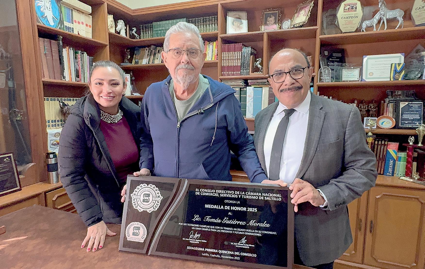 El haber recibido la Medalla de Honor Canaco 2025 por parte de la Cámara Nacional de Comercio de Saltillo ha venido a representar “la culminación de mi carrera en el comercio, ha sido como la cereza del pastel, prácticamente la conclusión de mi trayectoria en las empresas y el servicio a los demás”, expresó el reconocido comerciante ramosarizpense don Tomás Gutiérrez Morales. Entrevistado por el noticiario Despega con Chuchuy, de Tele Saltillo, en su despacho, en su casa, donde se recupera luego de una intervención quirúrgica, don Tomás asegura que la presea cobra mayor relevancia para su persona “porque tengo entendido que además de la trayectoria comercial, se otorga también a aquellas personas que se hayan destacado en acciones de apoyo a los demás, por su participación altruista, algo por lo que siempre nos hemos preocupado y ocupado”. El legado de su padre Al hablar de su trayectoria en el comercio, comparte que fue en 1967 cuando comenzó a trabajar al lado de su padre, don Roberto Gutiérrez Flores, quien en sociedad con don Sotero García fundó la Frutería Coahuila, en la entonces calle Venustiano Carranza (hoy Manuel Pérez Treviño), en el corazón del Centro de Saltillo, donde antes se focalizaba todo la actividad comercial, alrededor del Mercado Juárez.