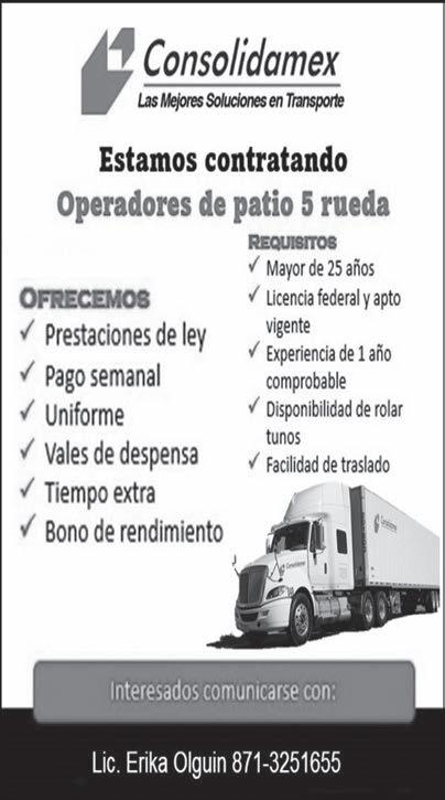 BUSCO CHOFER DE QUINTA RUEDA. ZONA DE TRABAJO, PATIO EN FINSA ATRAS DE GM.EXPERIENCIA EN MNEJO DE UNIDADES. DOCUMENTACION BASICA + LICENCIA B LOCAL VIGENTE. 2 CARTAS DE RECOMENDACION. MAYOR DE 28 AÑOS. BENEFICIOS. PRESTACIONES DE LEY. SALARIO $4,400.00 SEMANALES LIBRES. HORARIO DE 6 AM 6 PM DE LUNES A VIERNES CAMBIANDO TURNO CADA 15 DIAS INF AL 844362-57-23