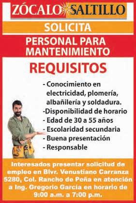 SE SOLICITA PERSONA PARA JARDINERIA Y MANTENIMIENTO, PARA TRABAJAR AL NORTE DE SALTILLO, CON BUENAS REFERENCIAS LABORALES, SE OFRECEN PRESTACIONES DE LEY Y BUEN SALARIO. INFORMES AL 844-20148-53