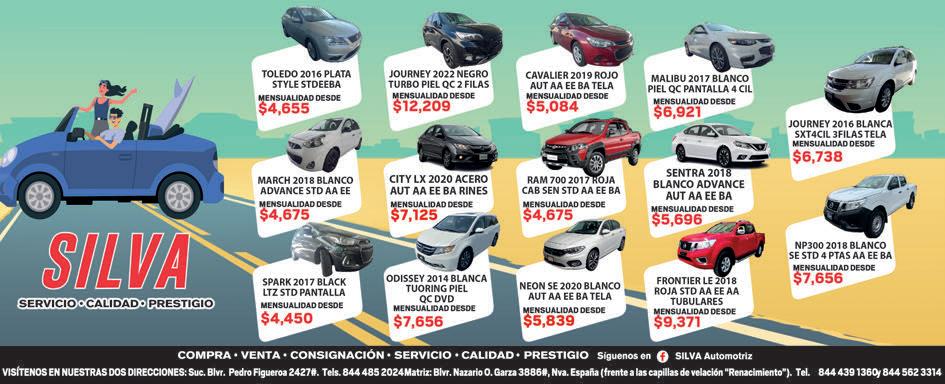 AUTOS CHEVROLET ATTIUTUDE SXT 2020 GRAFITO STD AA EE BA PANTALLA MENSUAL DESDE $5,063 844-439-13-60 AVEO LT 2017 GRIS STD AA EE BA MENSUAL DESDE $3,859 INFORMES AL 844439-13-60 AVEO LT 2018 AZUL STD AA EE BA ABS MENSUAL DESDE $4,471.00 844-439-1360 CAVALIER 2022 GRAFITO RS TURBO 3 CIL PIEL QC MENSUAL DESDE $8,146 844-43913-60 FIAT MOBI 2023 LIKE STD EE RINES MENSUAL DESDE $5,104.00 INFORMES 844-43913-60 MALIBU LT 2015 BLANCO AUT AA EE BA TEL 4 CIL MENSUAL DESDE$4,675 844-439-13-60 SENTRA 2018 BLANCO ADV AUT 34,914 KM MENSUAL DESDE $5,900 INFORMES AL 844-439-13-60 SONIC 2017 GRIS LT STD AA EE BA MENSUAL DESDE $4,675 AL 844-439-13-60 SPARK 2017 BLACK LTZ STD PANTALLA MENSUAL DESDE $4,450 INFORMES AL 844-439-13-60 FIAT FIAT MOBI 2020 GRIS OSCURO LIKE STD TELA 5 PTAS MENSUAL DESDE $4,328 844-439-13-60 FORD FUSION 2017 GRIS IMAN SE AUT PIEL QC CÁMARA MENSUALIDAD DESDE $7,350 AL 844-439-13-60 XT5 CADILLAC 2017 NEGRO PIEL QC CÁMARA 6 CIL MENSUAL DESDE $9.902 AL 844-439-13-60 FRONTIER LE 2019 ROJA STD AA EE BA TELA TUMBABURROS MENSUAL DESDE $9,371 INFORMES 844439-13-60 KICKS 2019 ROJO AUT PIEL AA EE BA MENSUAL DESDE $7,942.00 844-439-13-60 LINCONL MKX 2008 PLATA PIEL QC 6 CIL 2 FILAS MESUALIDAD DESDE $4,560 INFORMES 844-439-13-60 MARCH 2018 BLANCO ADVANCE STD AA EE MENSUAL DESDE $4,675 INFORMES AL 844-439-13-60 NEON SE 2020 BLANCO AUT AA EE BA TELA MENSUAL DESDE $5,839.00 INFORMES 844-439-13-60 SENTRA 2018 BLANCO ADVENCE AUT AC EE BA MENSUAL DESDE $5,696.00 844-439-13-60 VERSA ADVENCED 2016 ROJO STD AA EE BA CÁMARA RINES MENSUAL DESDE $5,492 INFORMES 844439-13-60