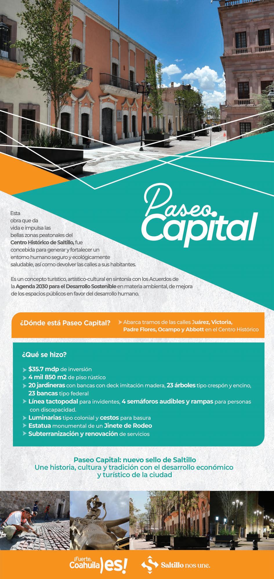 Esta obra, en la que se invirtieron más de 35.7 millones de pesos, da vida e impulsa las bellas zonas peatonales del Centro Histórico de Saltillo. Fue concebida para generar y fortalecer un entorno humano seguro y ecológicamente saludable, así como devolver las calles a sus habitantes..