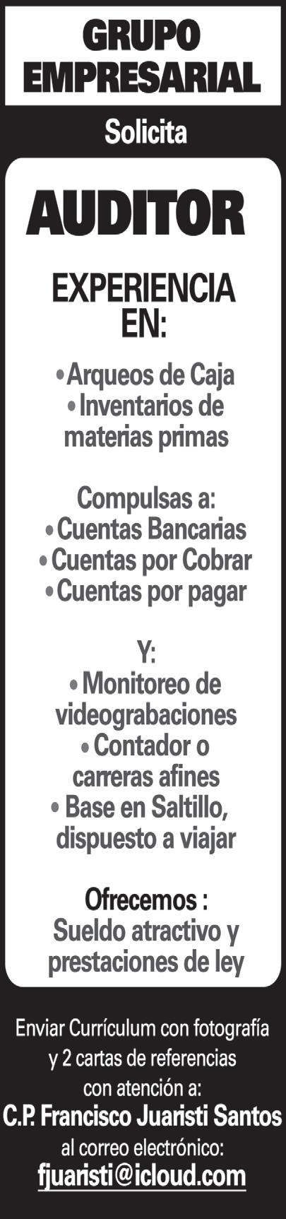 Interesados enviar C.V. con fotografía a goyo49@hotmail.com en atención a Ing. Gregorio García
