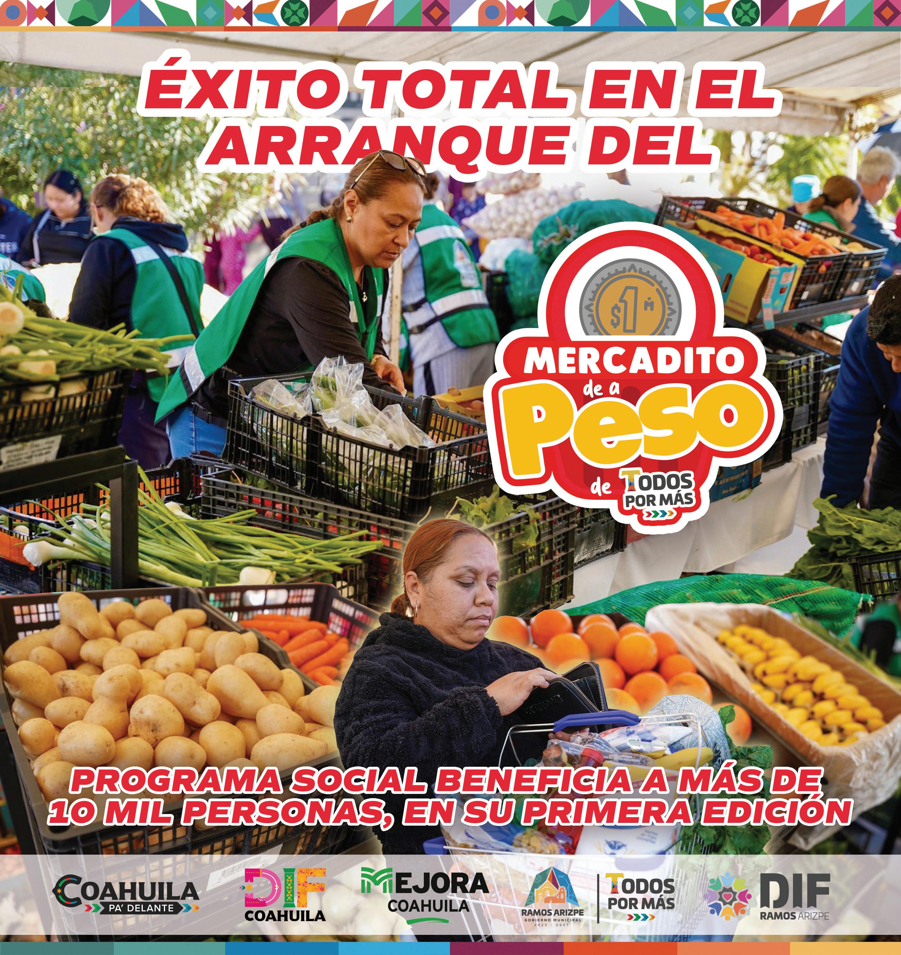 Aprovechando su experiencia en el negocio de los supermercados, además de una buena campaña de difusión entre la comunidad, el alcalde de Ramos Arizpe, Tomás Gutiérrez Merino, encabezó con gran éxito la primera edición del Mercadito de A Peso Todos por Más-Mejora. En el arranque del nuevo programa, que representará un beneficio para 10 mil personas, estuvo presente el administrador fiscal general del Estado, Chema Morales, así como la primera dama ramosarizpense, Teresita Escalante. Tomás puso el ejemplo al conseguir precios accesibles, todo a peso.