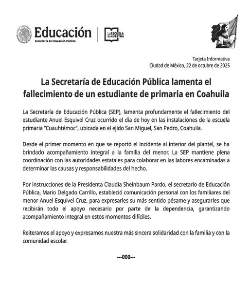Anoche, la Secretaría de Educación Pública señaló vía comunicado que, por instrucciones de la presidenta Claudia Sheinbaum, el titular de la dependencia federal, Mario Delgado, estableció comunicación directa con los familiares del menor para expresarles sus condolencias y reiterar el compromiso de apoyo total por parte de la SEP en estos momentos.