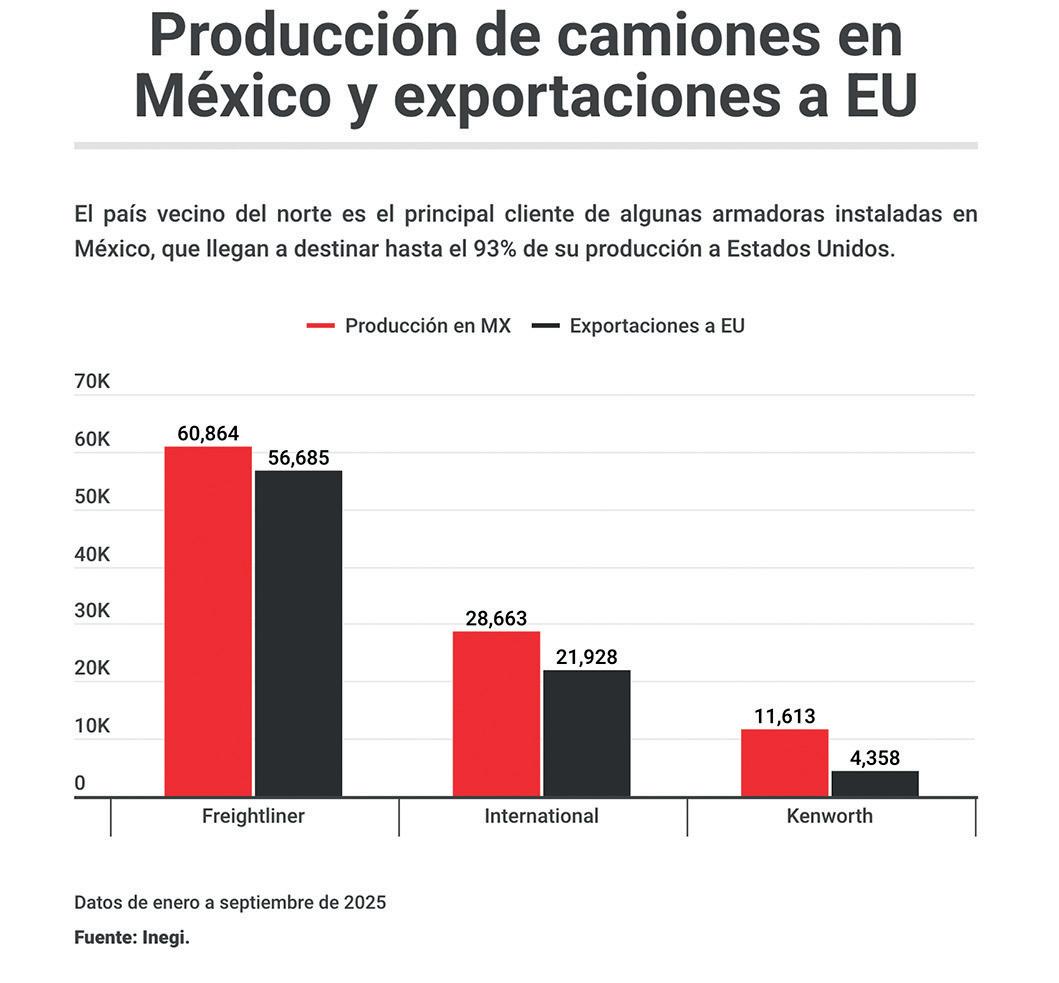 grupo en América del Norte. Kenworth, con planta en Mexicali, Baja California, tiene una dependencia menor, aunque no ajena. De las 11 mil 613 unidades producidas este año, alrededor de 37.5% fue enviado al mercado estadunidense. En conjunto, estas tres marcas concentran la mayor parte de las exportaciones mexicanas de camiones pesados, por lo que el impacto potencial del arancel podría extenderse a toda la cadena de suministro.