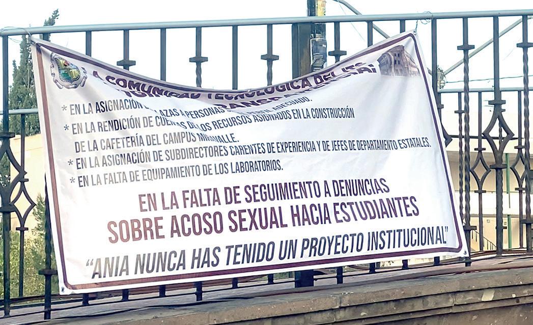 Con una lona colgada del puente peatonal ubicado frente al Tecnológico Nacional de México (TECNM) Campus Saltillo, se exige seguimiento a presuntas denuncias de acoso sexual que han sufrido estudiantes. En el mensaje, también se pide transparencia en la asig-