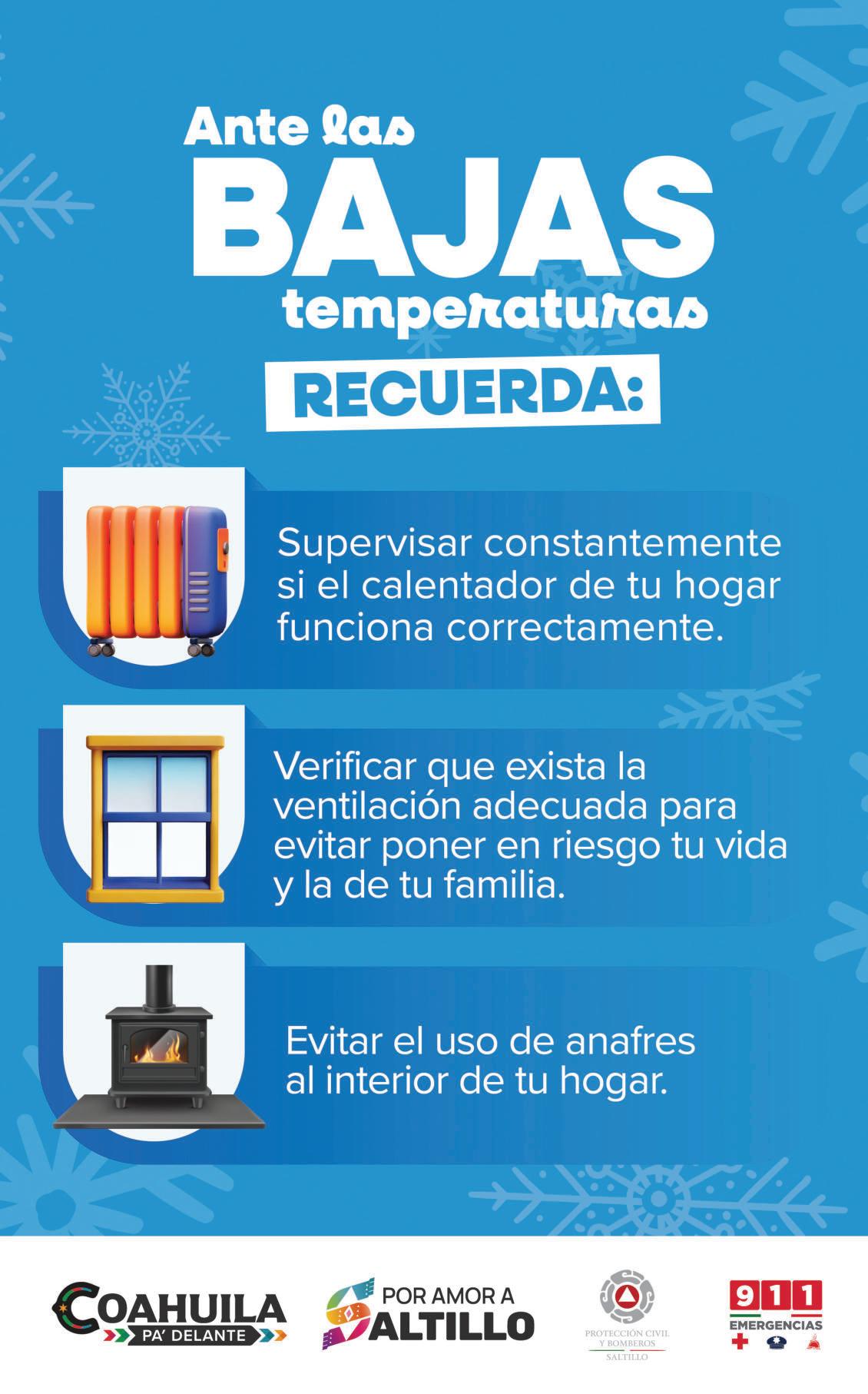 Indicó que no se deben usar braseros, hornos o estufas para calentar el hogar y que, en caso de utilizar calentadores, se debe corroborar su correcto funcionamiento, así como mantener una ventilación adecuada para evitar riesgos. Se exhortó además a la po-