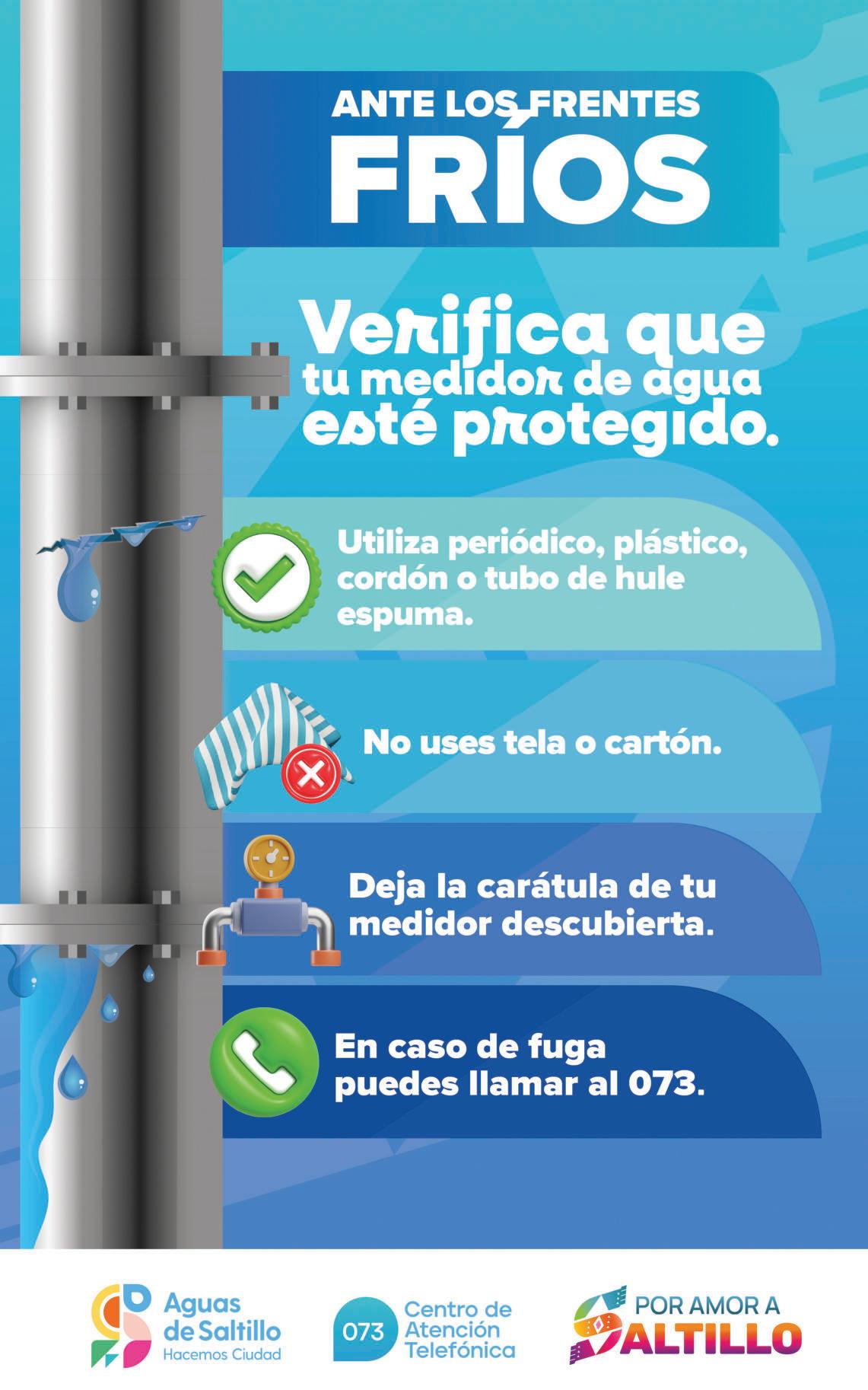 El Gobierno Municipal de Saltillo, a través de la Dirección de Protección Civil y Bomberos, exhortó a la población a tomar las precauciones necesarias para evitar incidencias, así como a mantenerse al tanto de la información oficial y, en caso de cualquier situación de emergencia, comunicarse al 9-1-1. Francisco Martínez Ávalos, director de la dependencia, mencionó que ante el descenso de temperatura es importante abrigarse adecuadamente; consumir frutas y verduras ricas en vitamina C; e ingerir