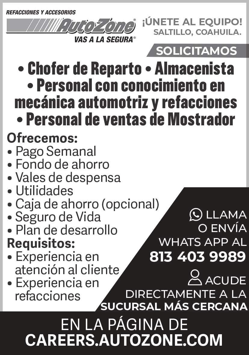 EDUCATIVA UBICADA AL NORTE DE SALTILLO SOLICITA AUXILIAR DE LIMPIEZA, PRESTACIONES SUPERIORES A LAS DE LEY, OFRECEMOS BUEN SUELDO, EXCELENTE AMBIENTE DE TRABAJO; REQUISITOS INDISPENSABLES, SEXO FEMENINO, EDAD DE 25 A 55 AÑOS, DISPONIBILIDAD DE HORARIO, QUE VIVA AL NORTE DE SALTILLO O BIEN EN RAMOS ARIZPE, SOLICITUD PRINTAFORM, INDISPENSABLE PRESENTARSE A ENTREVISTA. TELEFONOS: 844439-85-84 Y 844439-87-75 EXT. 14 Y SOLO WHATSAPP 844-159-9577.