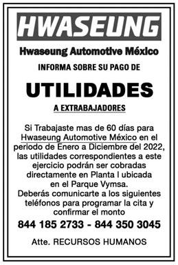 AUTOS CHEVROLET 400SS 1998 ROJA CAB SENCILLA AUT TELA MENSUAL DESDE $6,105.00 844-4-39-13-60 ATTIUTUDE SXT 2020 GRAFITO STD AA EE BA PANTALLA MENSUAL DESDE $5,063 844439-13-60 AVEO LT 2018 AZUL STD AA EE BA ABS MENSUAL DESDE $4,471.00 844-439-13-60 BEAT 2020 ROJO SEDAN STD AA EE BA MENSUAL DESDE $5,083 INFORMES AL 844-439-13-60 CAVALIER 2022 GRAFITO RS TURBO 3 CIL PIEL QC MENSUAL DESDE $8,146 844-43913-60 CAVALIER LS 2019 ROJO AUT AA EE BA TELA MENSUAL DESDE $5,084.00 844-439-13-60 FOCUS 2014 ROJO LUXURY AUT PIEL MENSUAL DESDE $5,083 INFORMES AL 844-439-13-60 MALIBU 2017 BLANCO PIEL QC PANTALLA 4 CIL MENSUALIDAD DESDE $6921.00 844-43913-60 MALIBU LT 2013 PLATA AUT 4 CIL TELA MENSUAL DESDE $3,778 INFORMES AL 844-439-13-60 MALIBU LT 2015 BLANCO AUT AA EE BA TEL 4 CIL MENSUAL DESDE$4,675 844-439-13-60 SONIC 2017 GRIS LT STD AA EE BA MENSUAL DESDE $4,675 AL 844-439-13-60 SPARK 2017 BLACK LTZ STD PANTALLA MENSUAL DESDE $4,450 INFORMES AL 844-43913-60 TRAXX LT 2018 ROJA AUT AA EE BA PIEL MENSUAL DESDE $6,513.00 844-439-13-60 FIAT FIAT MOBI 2020 GRIS OSCURO LIKE STD TELA 5 PTAS MENSUAL DESDE $4,328 844-439-13-60 FORD FUSION 2017 GRIS IMAN SE AUT PIEL QC CÁMARA MENSUALIDAD DESDE $7,350 AL 844-439-13-60 XT5 CADILLAC 2017 NEGRO PIEL QC CÁMARA 6 CIL MENSUAL DESDE $9.902 AL 844-439-13-60 NISSAN ALTIMA 2016 PLATA ADV NAVI AUT PIEL QC MENSUAL DESDE $5,900.00 844-439-13-60 FRONTIER LE 2019 ROJA STD AA EE BA TELA TUMBABURROS MENSUAL DESDE $9,371 INFORMES 844-439-13-60 KICKS 2019 ROJO AUT PIEL AA EE BA MENSUAL DESDE $7,942.00 844-439-13-60 LINCONL MKX 2008 PLATA PIEL QC 6 CIL 2 FILAS MESUALIDAD DESDE $4,560 INFORMES 844-439-13-60 MARCH 2018 BLANCO ADVANCE STD AA EE MENSUAL DESDE $4,675 INFORMES AL 844-439-13-60 NEON SE 2020 BLANCO AUT AA EE BA TELA MENSUAL DESDE $5,839.00 INFORMES 844-439-13-60 SENTRA 2018 BLANCO ADVENCE AUT AC EE BA MENSUAL DESDE $5,696.00 844439-13-60 VERSA ADVENCED 2016 ROJO STD AA EE BA CÁMARA RINES MENSUAL DESDE $5,492 INFORMES 844-439-13-60 SEAT IBIZA 2018 BLANCA REFERENCE STD QC MENSUAL DESDE $5,900.00 844-439-13-60 OTROS AQUI COMPRAMOS CARROS PARA DESARMAR. 844-285-99-68 COMPRO CARROS PARA DESARMAR, INFORMES AL 844311-10-96 y 844-290-16-81 ATTITUDE 2017 PLATA SE STD AA BA MESNUALIDAD DESDE $4,063.00 844-439-13-60 ATTITUDE 2020 PLATA SXT AUT RINES CAMARA MENSUAL DESDE $5,288.00 AL 844-439-13-60 SUV Y PICK UP CHRYSLER TOWN & COUNRY 2011 BLANCA LTD PIEL QC CÁMARA 3 FILAS MENSUALIDAD DESDE $5,206.00 844-439-13-60 FORD ESCAPE 2014 PLATA “S” AUT AA EE BA MENSUAL DESDE $5,084 844-439-13-60 F-150 2011 ROJO XL AUT 6 CIL CAB EXT MENSUAL DESDE $5,6,105.00 844-439-13-60 MAZDA MAZDA CX-9 2009 ALUMINIO 3 FILAS PIEL QC DVD MENSUAL DESDE $5,696.00 844439-13-60 NISSAN NP300 2018 BLANCA SE STD 4 PTAS AA EE BA MENSUAL DESDE $7,656.00 844-439-1360 DODGE CAVALIER 2020 BLANCO PREMIER AUT PIEL QC MENSUALIDAD DESDE $6,513.00 844439-13-60 JOURNEY 2016 BLANCA SXT 4 CIL 3 FILAS TELA MENSUAL DESDE $6,738 844-439-13-60 JOURNEY 2022 NEGRO TURBO PIEL QC 2 FILAS MENSUALIDAD DESDE $12,209 844-43913-60 RAM 700 2017 ROJA CAB SEN STD AA EE BA MENSUAL DESDE $4,675 844-439-13-60 RAV4 2016 PLATA XLE TELA QC PANTALLA MENSUAL DESDE $7,534.00 844-439-13-60 TOWN &COUNTRY 2012 BLANCO PIEL QC 3 FILAS PANTALLA MENSUAL DESDE $5,819 844-439-13-60 MINI VAN Y VANS HONDA JOURNEY SE 2017 ROJA AUT TELA 3 FILAS 4 CIL MENSUAL DESDE $6,717 INFORMES AL 844-439-13-60 ODISSEY 2011 BLANCA EXL AUT PIEL 3 FILAS MENSUAL DESDE $5,288.00 INFORMES AL 844-439-13-60 ODISSEY 2014 BLANCA TUORING PIEL QC DVD MENSUAL DESDE $7,656 INFORMES AL 844-439-13-60 NISSAN X-TRAIL 2016 GRIS ADVANCED QC CÁMARA MENSUAL DESDE $6,513 INFORMES AL 844-439-13-60 COMPRADORES SOLICITO TERRENO DESDE 5,000 M2. PARA DESARROLLO HABITACIONAL / INDUSTRIAL. 844-543-86-02 VENTA CASAS NORTE CASA EN VENTA EN FRACCIONAMIENTO RESIDENCIAL PRIVADO ALCAZAR RESIDENCIAL AREA DE CONSTRUCCCION 330 MTS2. CONSTRUIDA EN DOS PLANTAS, CUATRO RECAMARAS CADA UNA CON SU BAÑO, SALA TV, COCINA, AREA DE ANTECOMEDOR, SALA-COMEDOR, COCHERA DOBLE TECHADA, AREA DE LAVANDERIA , AREA DE JARDIN PRECIO $7,200,000.00 INFORMES AL 844-357-49-40